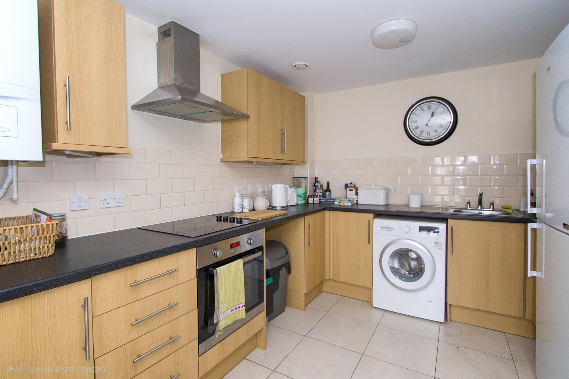 A fitted kitchen comprising of wall units and base units with laminate work surfaces. Single bowl stainless steel sink unit with drainer. Integrated electric oven, four zone electric hob and extractor fan. Space for a counter level fridge freezer. Power points. Plumbing for a washing machine. Tiled floor and part tiled walls.