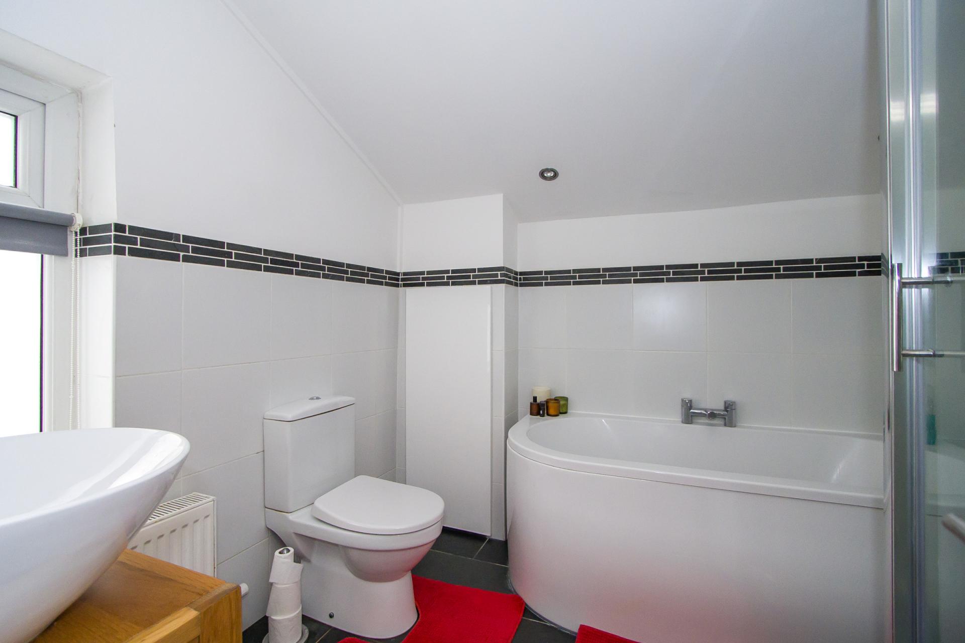 A bathroom with a suite comprising a panelled bath, shower cubicle, WC and sink with storage below. uPVC double glazed window to the side. Central heating radiator. Recessed lights and extractor fan. Vinyl flooring and part tiled walls. Built-in cupboard with gas combination boiler.