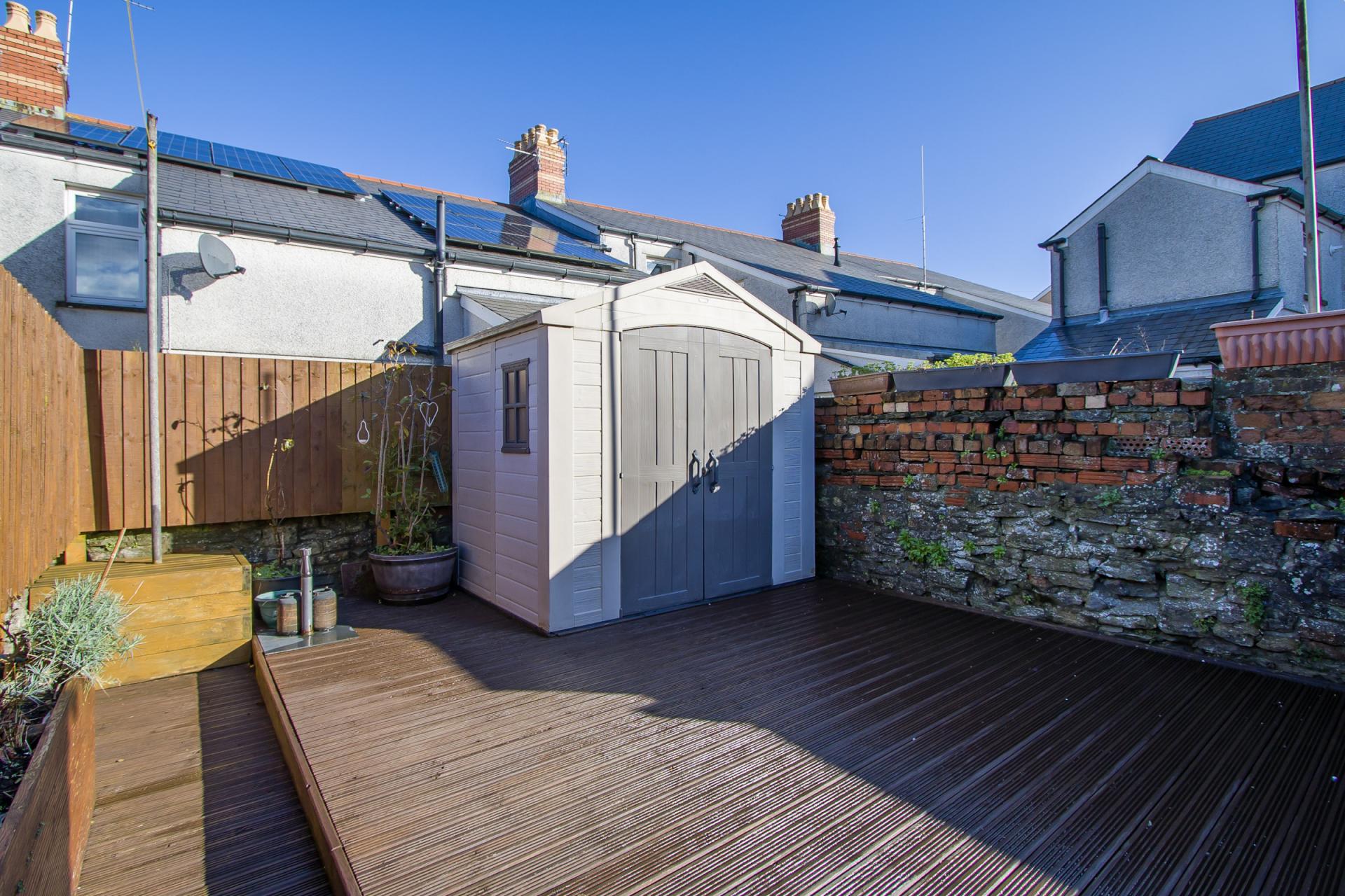An enclosed rear garden over two levels with paved patio and timber deck. Original stone walls to all three side, with additional fencing for privacy. Large storage shed.