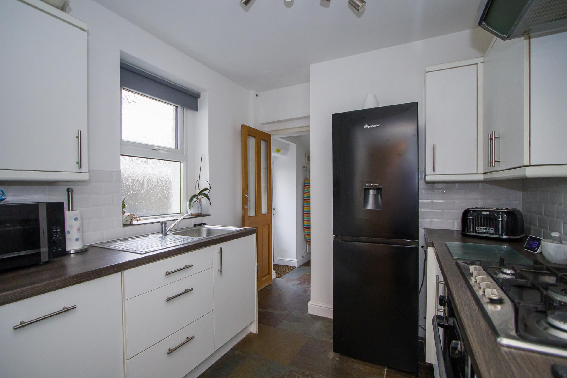 Tiled flooring. Fitted kitchen comprising wall units and base units with laminate work surfaces. Integrated appliances including an electric oven, five burner gas hob, extractor hood and a dishwasher. Space for a fridge freezer. Single bowl stainless steel sink with drainer. Part tiled walls. uPVC double glazed window to the side and a door into the utility room. Power points. Central heating radiator.