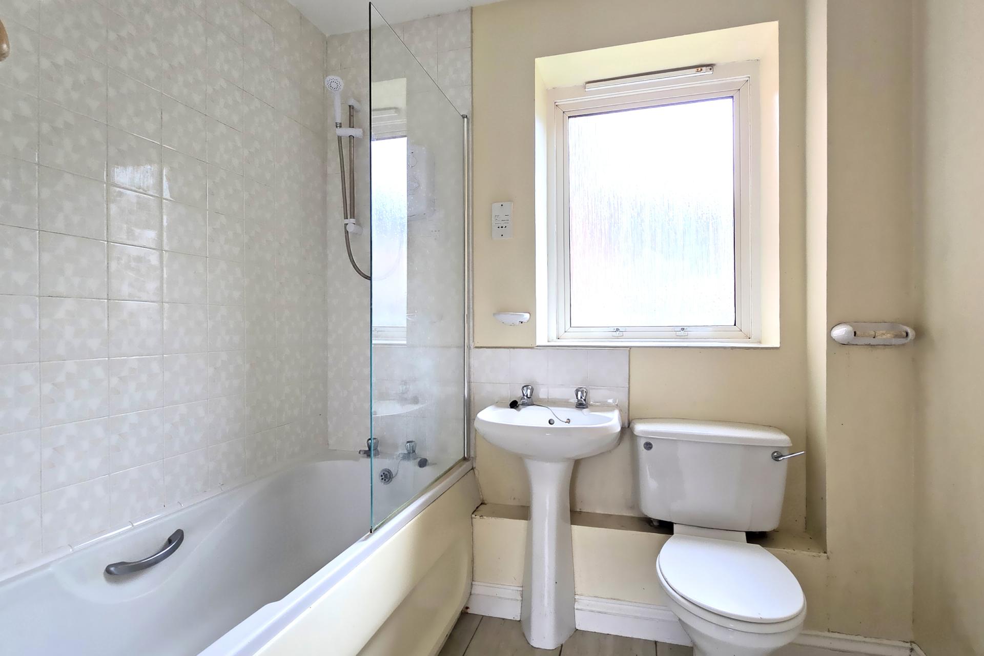 Suite comprising a panelled bath with electric shower, a pedestal sink and a WC. Double glazed window. Shaver point. Wall mounted electric heater. Vinyl flooring.