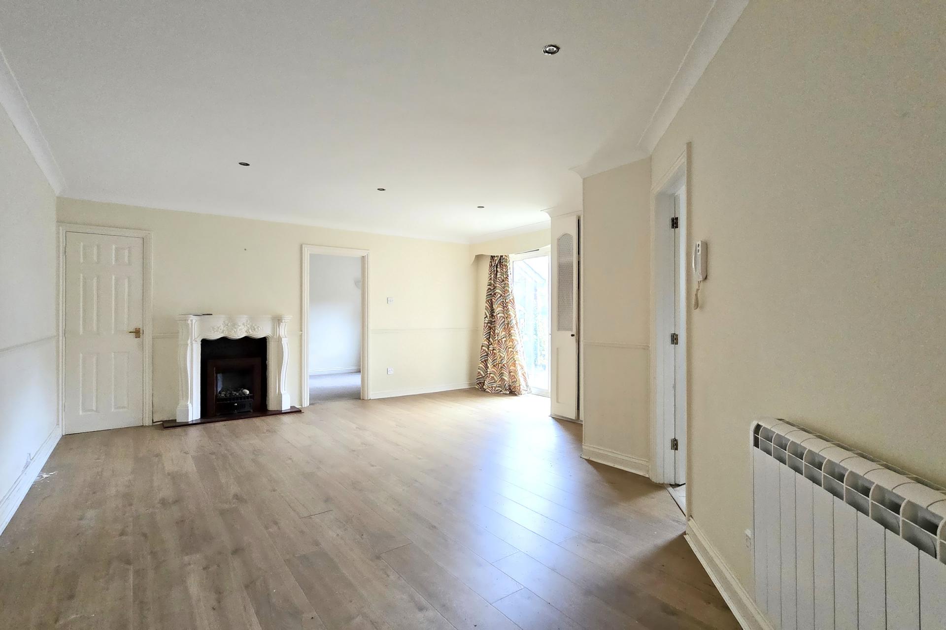 A spacious living / dining room with access to the kitchen and bedroom as well as out into the garden. Laminate flooring throughout. Recessed lighting. Coved ceiling and dado rail. Fitted storage. Phone, TV and power points. Wall mounted electric heater. Decorative fireplace. Double glazed sliding doors into the garden.