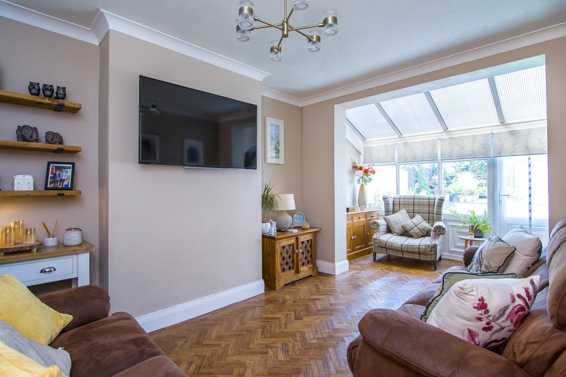 Herringbone flooring continued from the hall. This is a spacious living room that extends into an open plan conservatory style space with perspex roof and uPVC double glazed windows and doors into the garden. Central heating radiator. Power points and TV point. Coved ceiling. Opening into the kitchen.