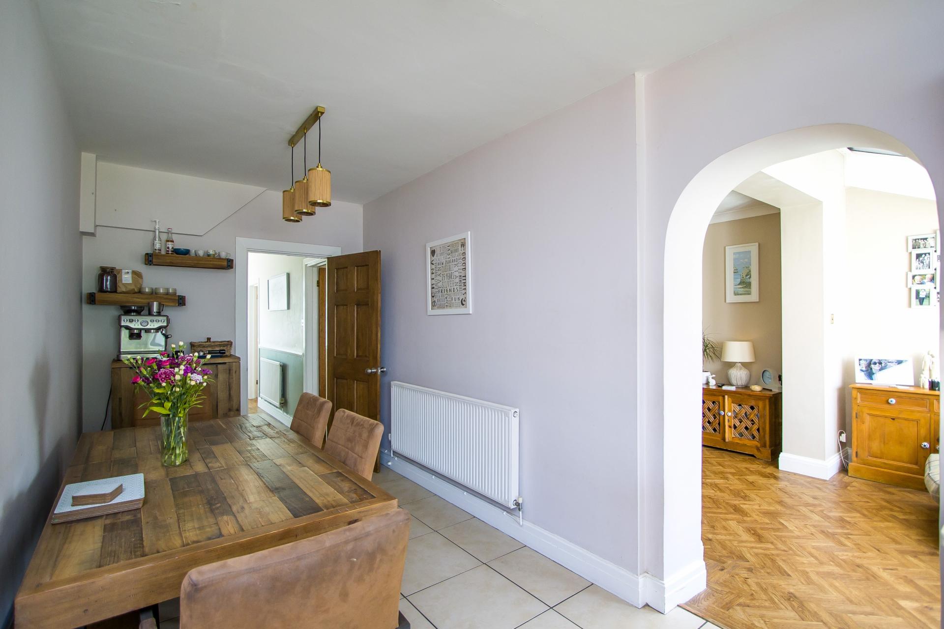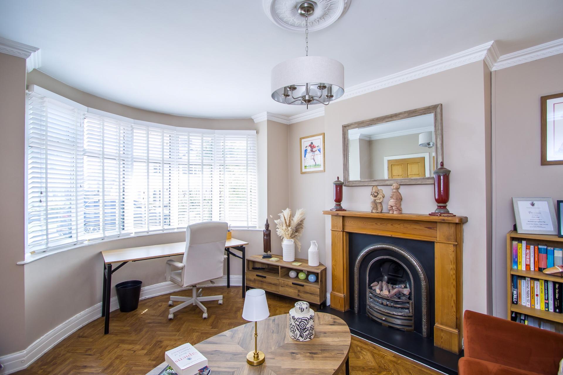 A pleasant front facing reception room that provides versatile space as a sitting room, playroom or home office. Herringbone LVT flooring continued from the hall. uPVC double glazed bay window to the front. Period style fireplace with wooden surround, cast iron gas fire and a slate hearth. Coved ceiling. Power points and TV point. Central heating radiator.