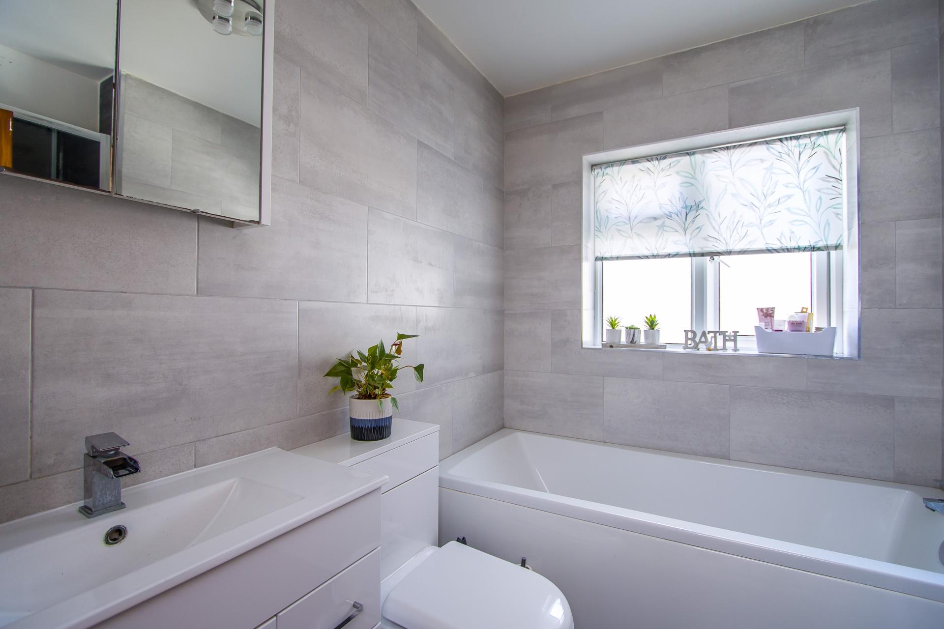 A modern bathroom with suite comprising a panelled bath, WC, sink with storage below and a shower cubicle with mixer shower. Heated towel rail. Extractor fan. Tiled floor and fully tiled walls. uPVC double glazed window to the side.
