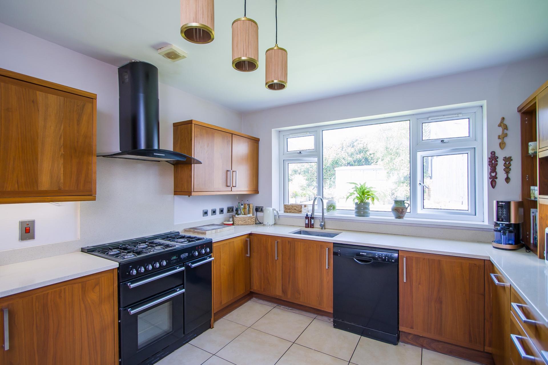 An open plan kitchen with dining space and a uPVC double glazed window to the rear onto the garden. The fitted kitchen comprises a mixture of fitted shelving, wall units and base units with wood effect doors and light quartz work surfaces. Rangemaster range cooker with double oven, grill and five burner gas hob. Extractor hood. Plumbing for dishwasher and space for an American style fridge freezer. Stainless steel countersunk sink with drainer. Power points. Tiled flooring throughout. Space for a dining table and chairs. Central heating radiator. Power points. Extractor fan.