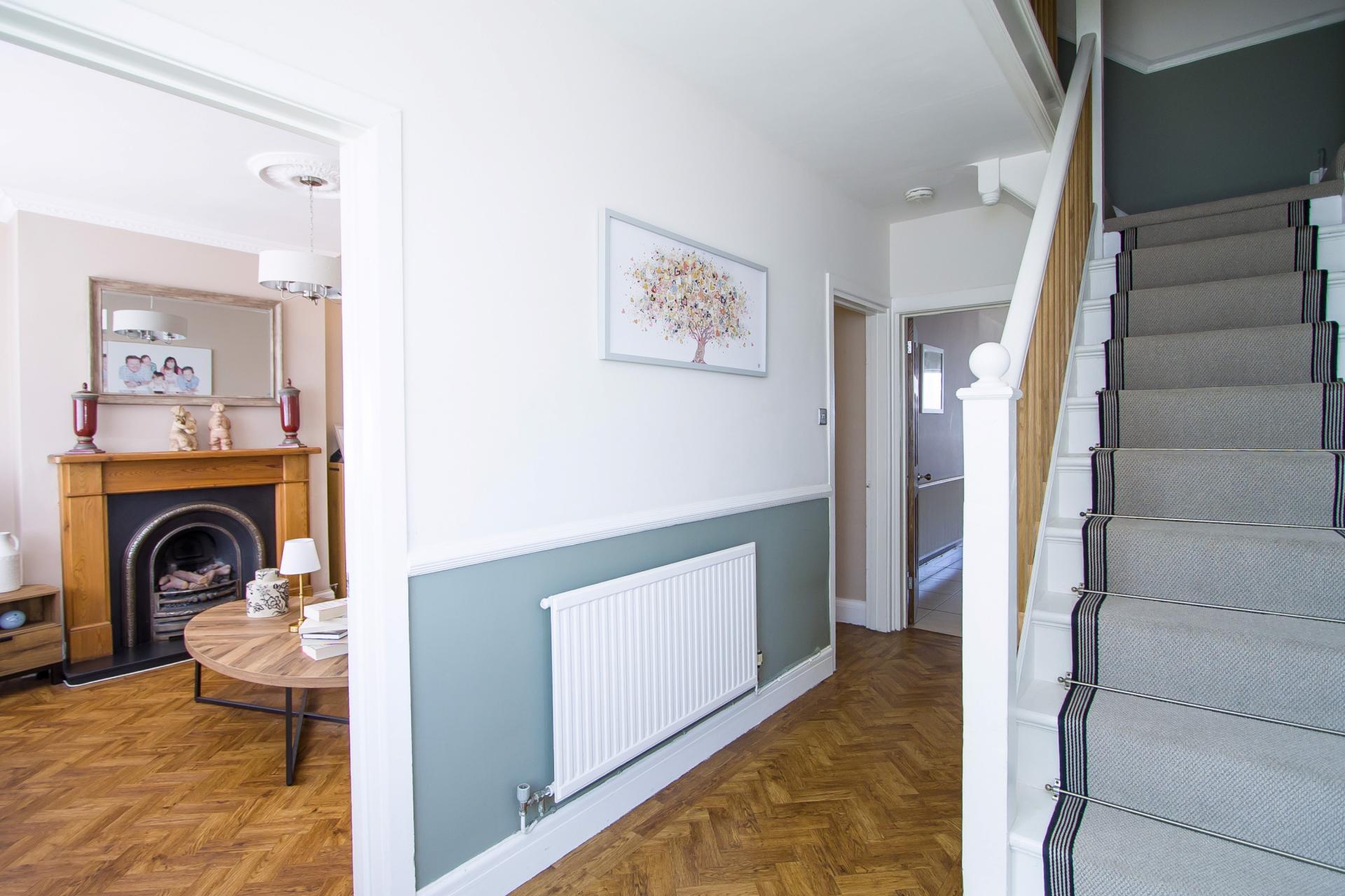 Composite front door with two double glazed panels. uPVC double glazed window to the front with original leaded stained glass. Herringbone LVT flooring. Two central heating radiators. Dado rails. Power points and phone point. Doors to the sitting room, living room, kitchen / diner, utility, WC and a second front door. Under stair cupboard.