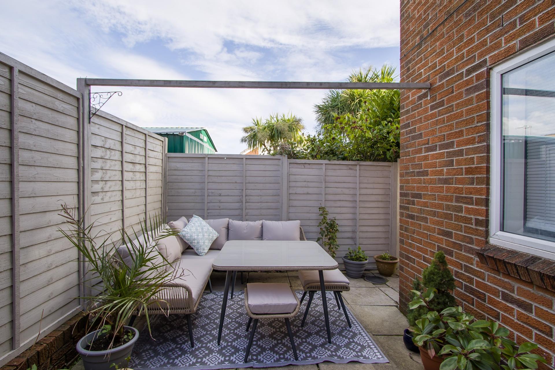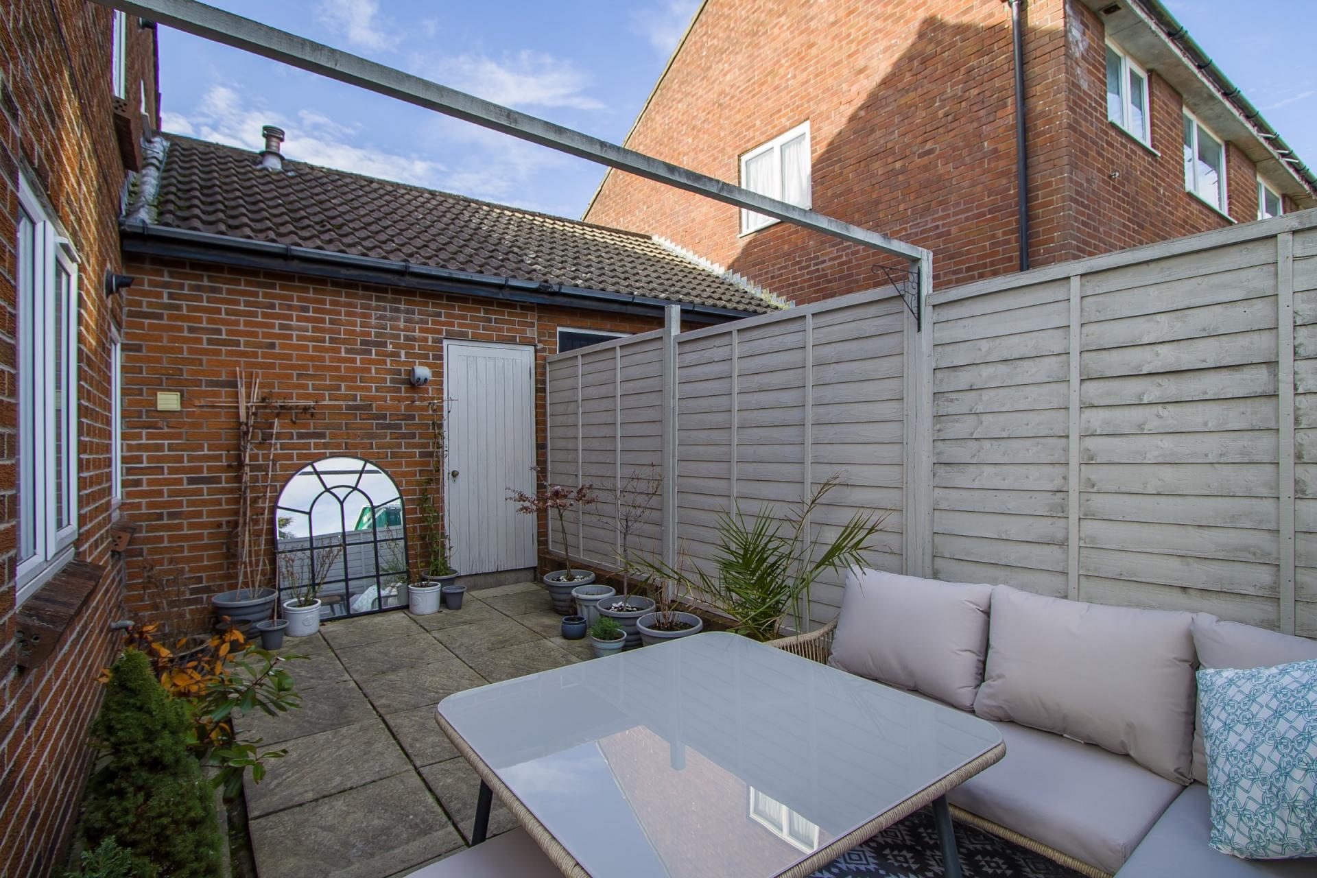 A private, paved rear garden accessed from the garage. Painted boundary fencing. Space for sitting and dining and for storage.