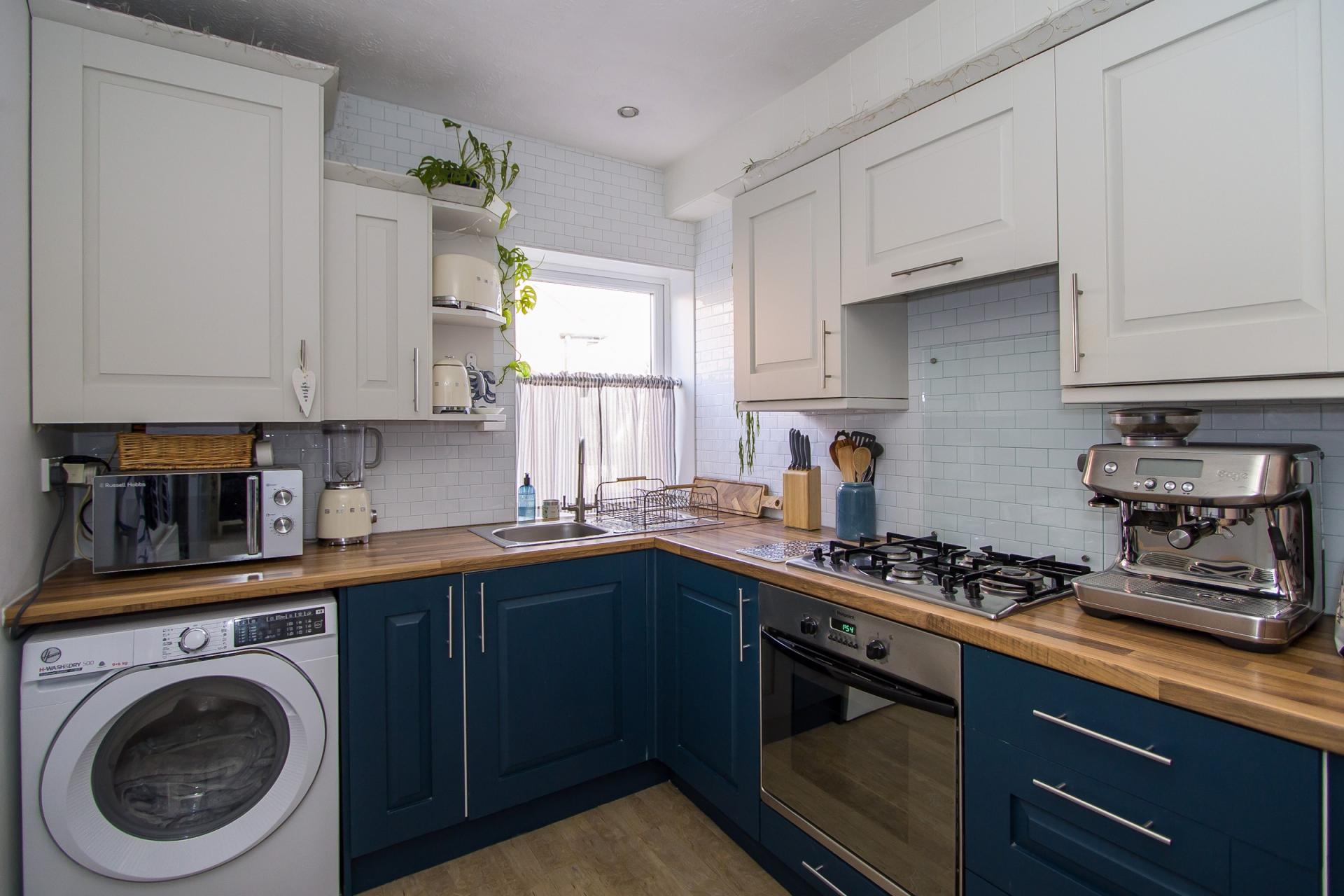LVT flooring. Fitted kitchen comprising wall units and base units with wood effect laminate work surfaces. Integrated appliances including an electric oven, four burner gas hob and an extractor hood. Plumbing for washing machine. Space for a tall fridge freezer. Single bowl stainless steel sink with drainer. uPVC double glazed window to the side. Recessed lighting. Central heating radiator. Cupboard with gas combination boiler.