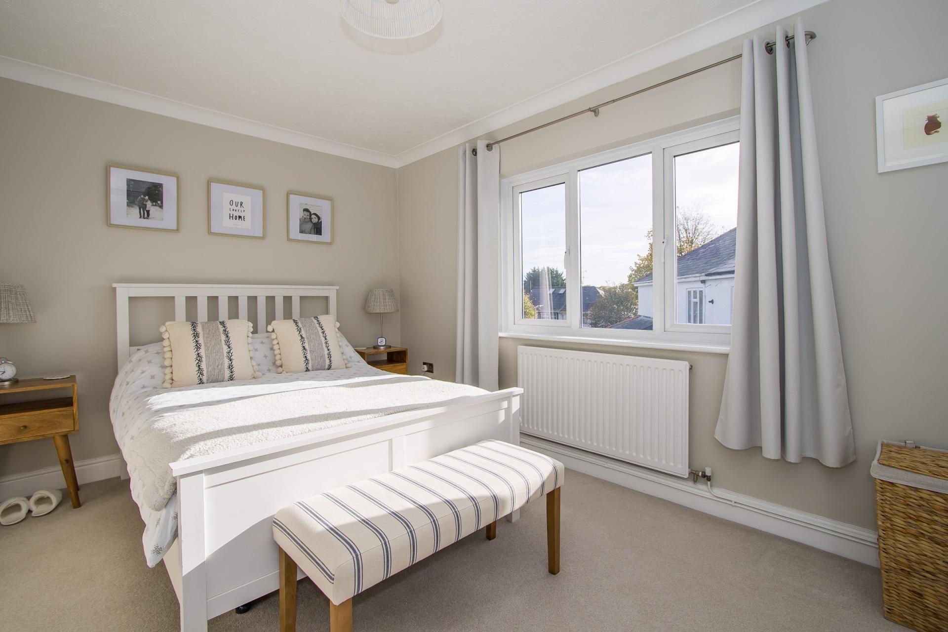 A spacious double bedroom with a large uPVC double glazed window to the south side that brings in lots of lovely natural light. Fitted wardrobes with sliding doors and power points. Central heating radiator. Power points. Fitted carpet. Coved ceiling.