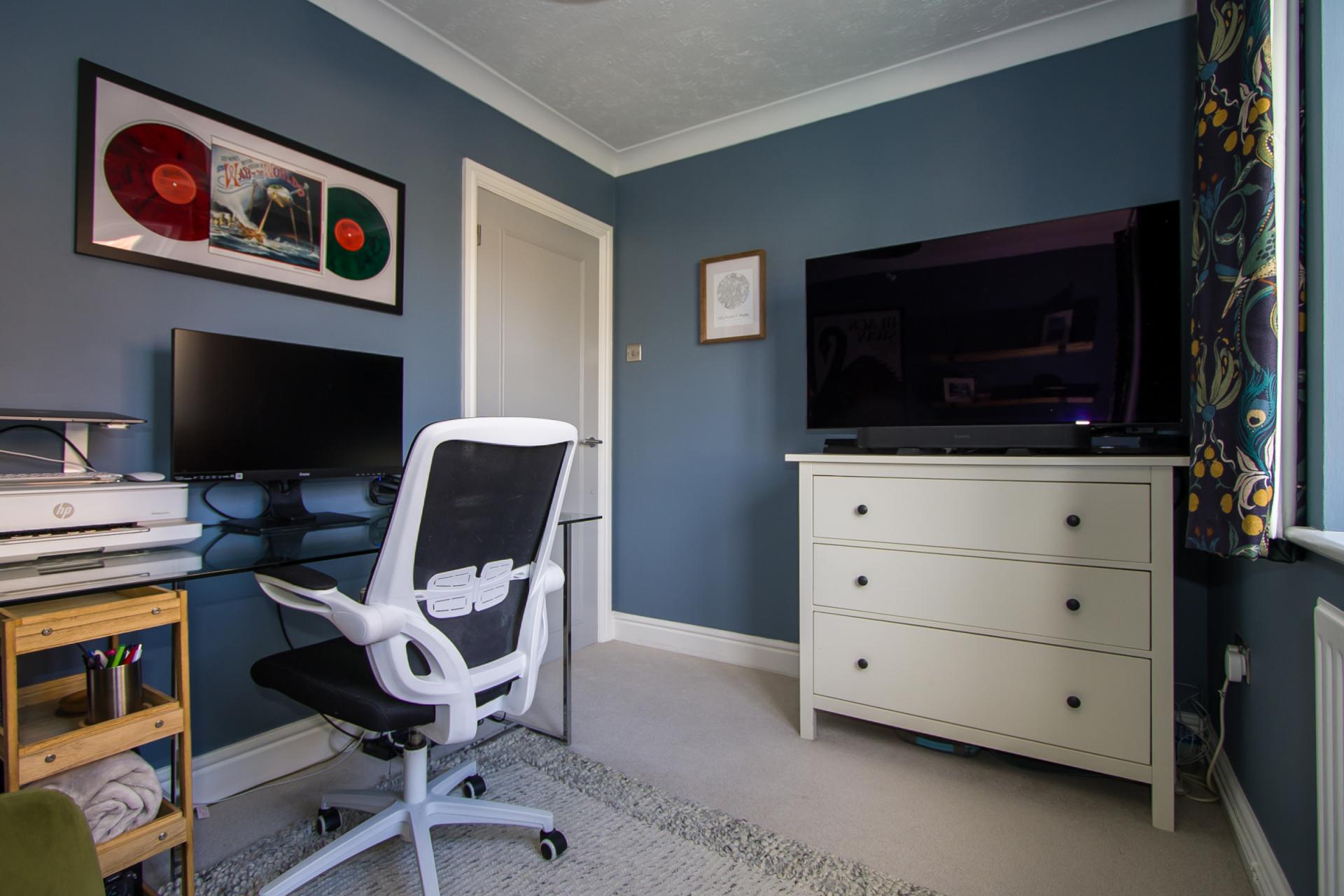 A very useful second bedroom, ideal as a home office. Fitted carpet. uPVC double glazed window to the side. Coved ceiling. Central heating radiator. Power points and TV point.