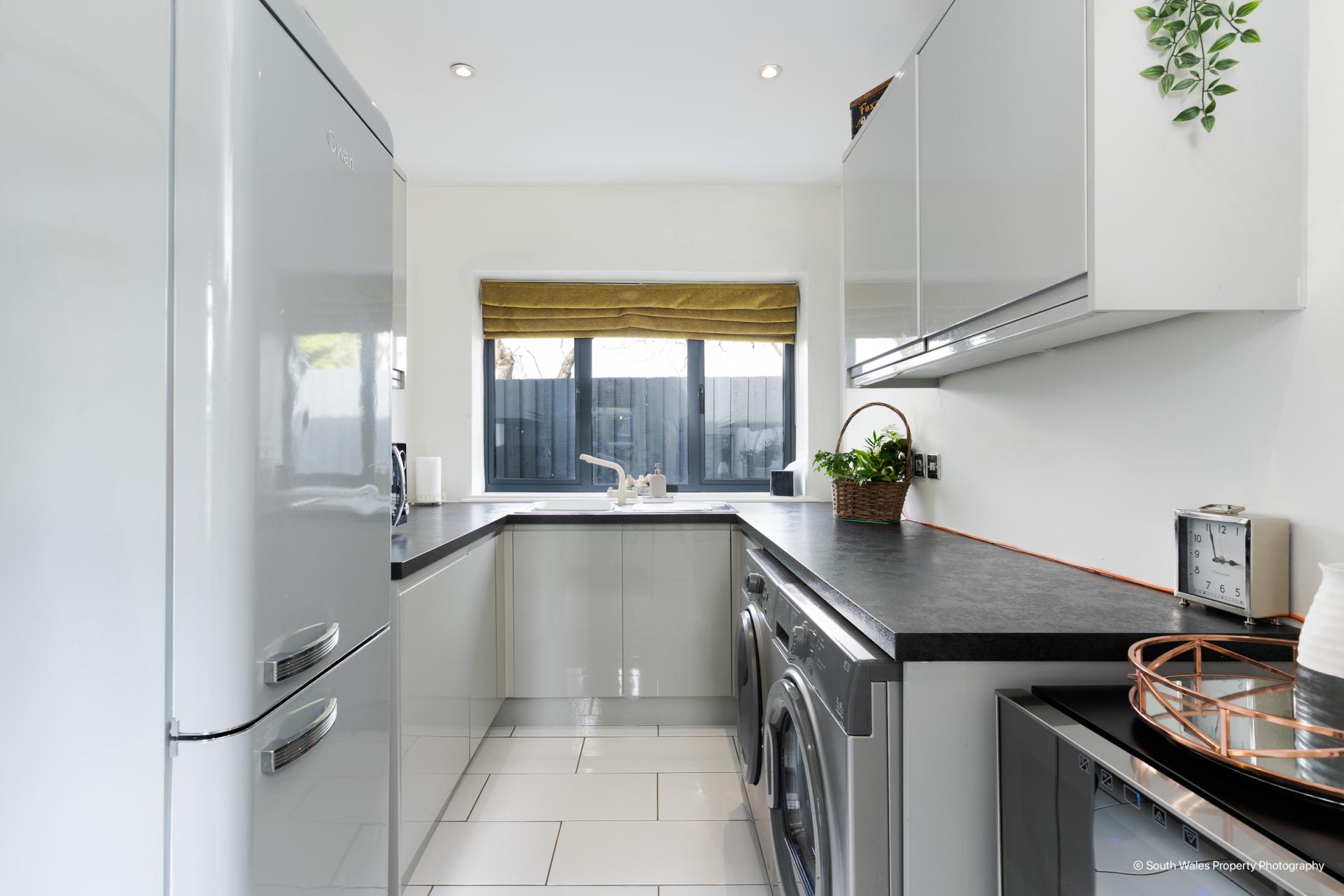 Fitted wall and base units to match the kitchen. Aluminium double glazed window to the rear and a wooden door to the front. Space for a tall fridge freezer. Single bowl stainless steel sink with drainer. Plumbing for washing machine and dryer. Wall mounted gas combination boiler. Recessed lights. Power points.