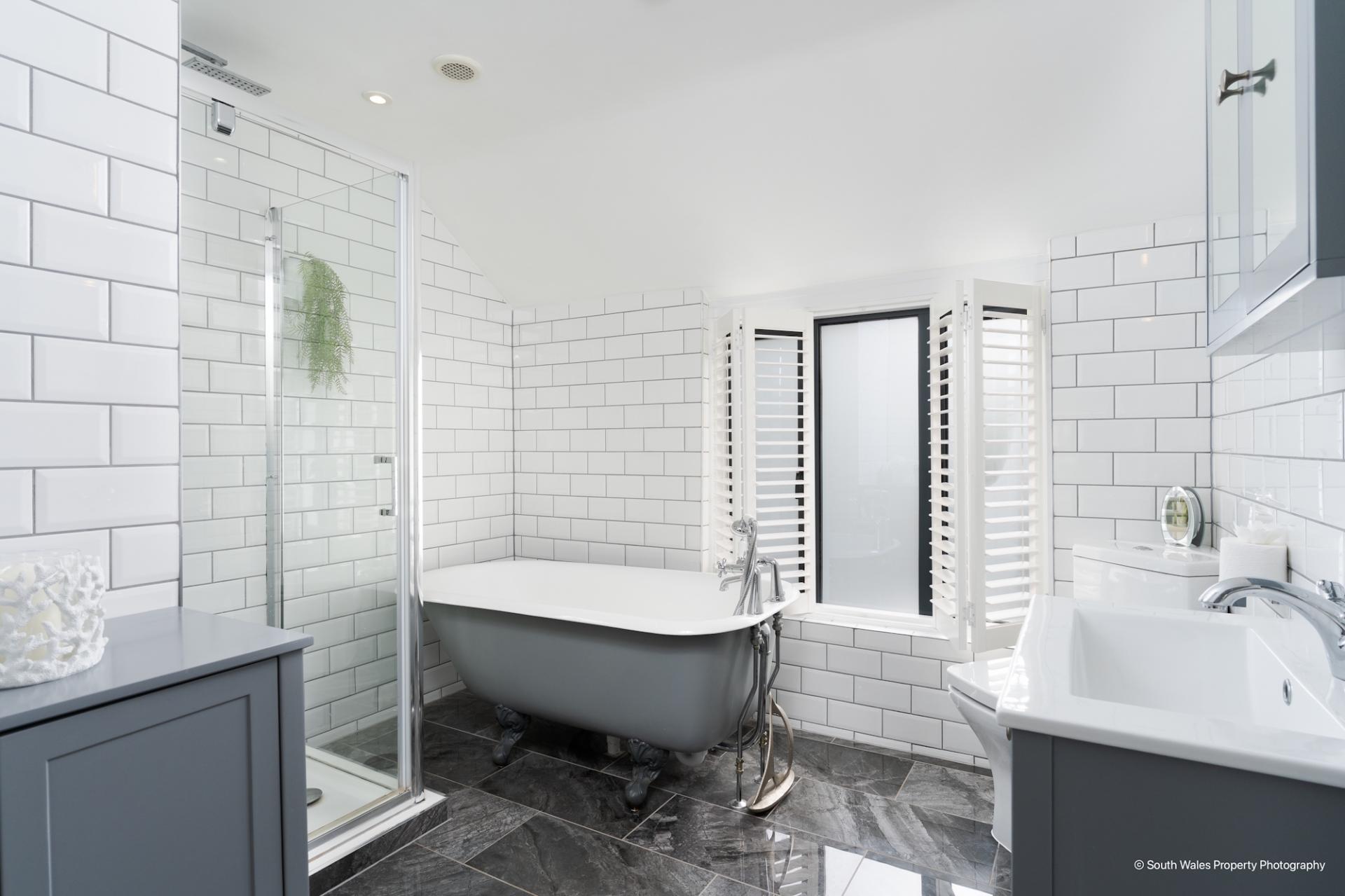 A quality, stylish bathroom with tiled floor and fully tiled walls. Suite comprising a freestanding bath with hand shower fitting, shower cubicle with twin head mixer shower, WC and sink with storage below. Wall light and recessed lights. Central heating radiator. Under floor heating.