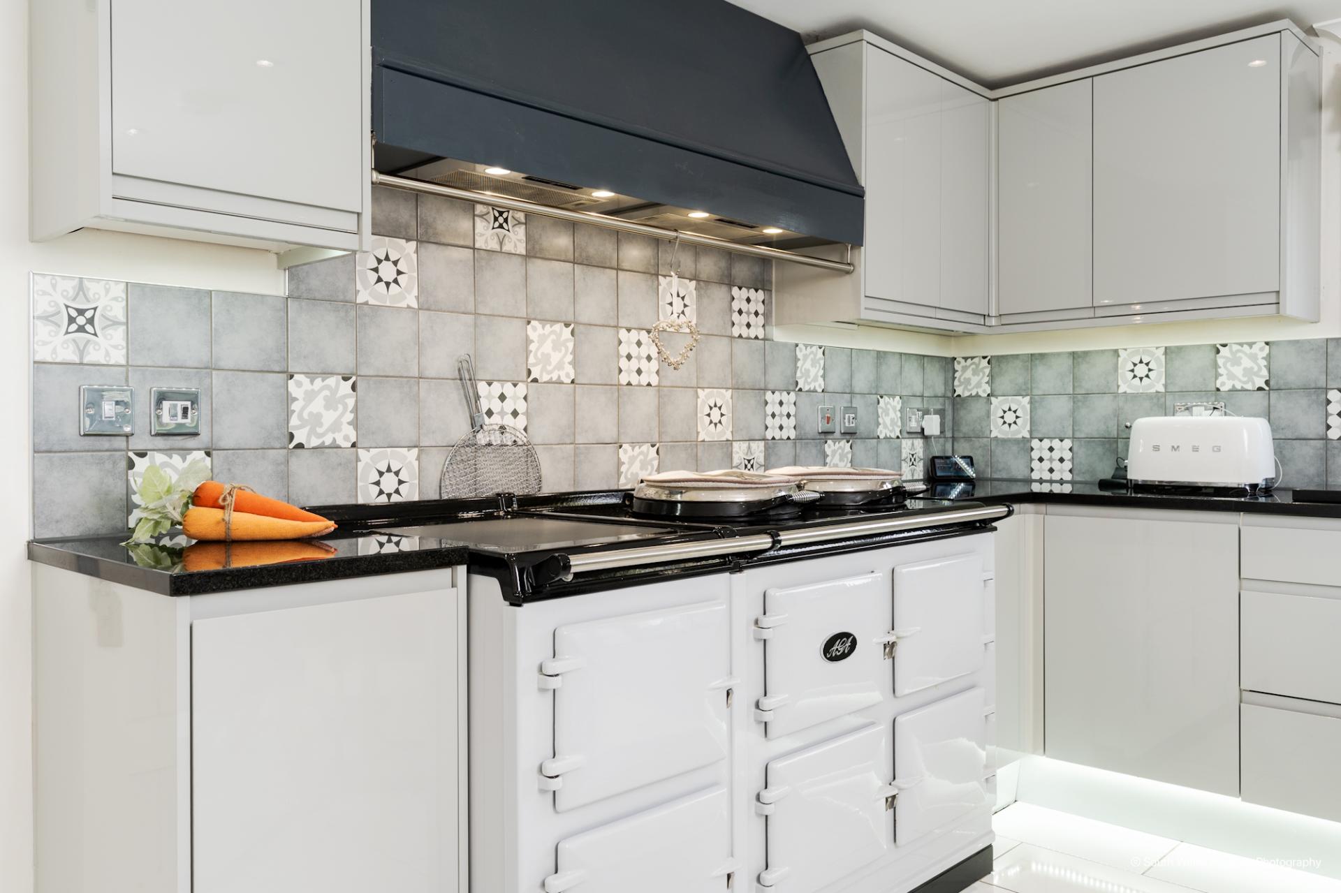 A magnificent kitchen comprising fitted wall and base units with grey gloss doors and granite work surfaces. Integrated appliances including a dishwasher and counter level fridge. Aga with triple oven. Integrated extractor hood. Aluminium double glazed window to the rear. Barn style door to the side into the garden. Pantry cupboard. Part tiled walls. Recessed lighting.