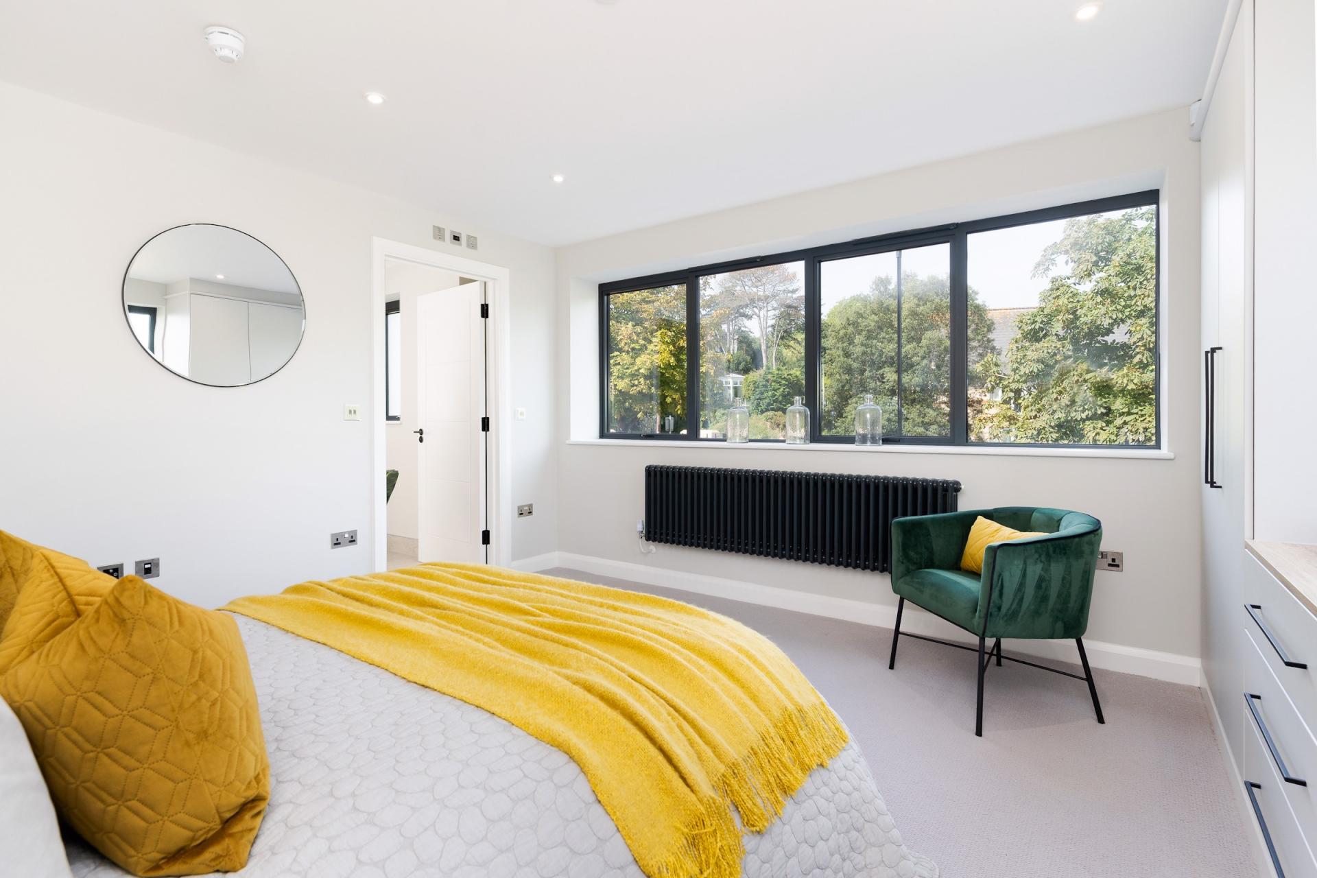The main bedroom is also dual aspect with aluminium double glazed windows to the front and side - with the side window looking down Bridgeman Road to the sea. There is a range of fitted storage with wardrobes and drawer units. The en-suite shower room has a large shower cubicle, WC and a sink with storage below.