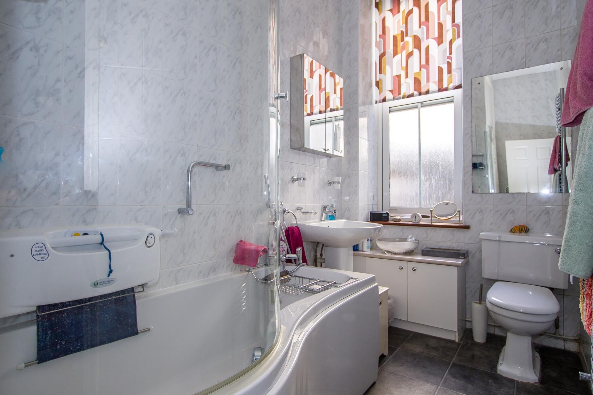 Vinyl floor and tiled walls. Suite comprising a curved panelled bath with mixer shower and glass screen, a WC and a pedestal sink. Built-in low level cupboard and an airing cupboard with hot water cylinder and fitted shelving. Heated towel rail. Wall cabinet with mirrored doors. Recessed lights. Extractor fan. uPVC double glazed sash window to the side.