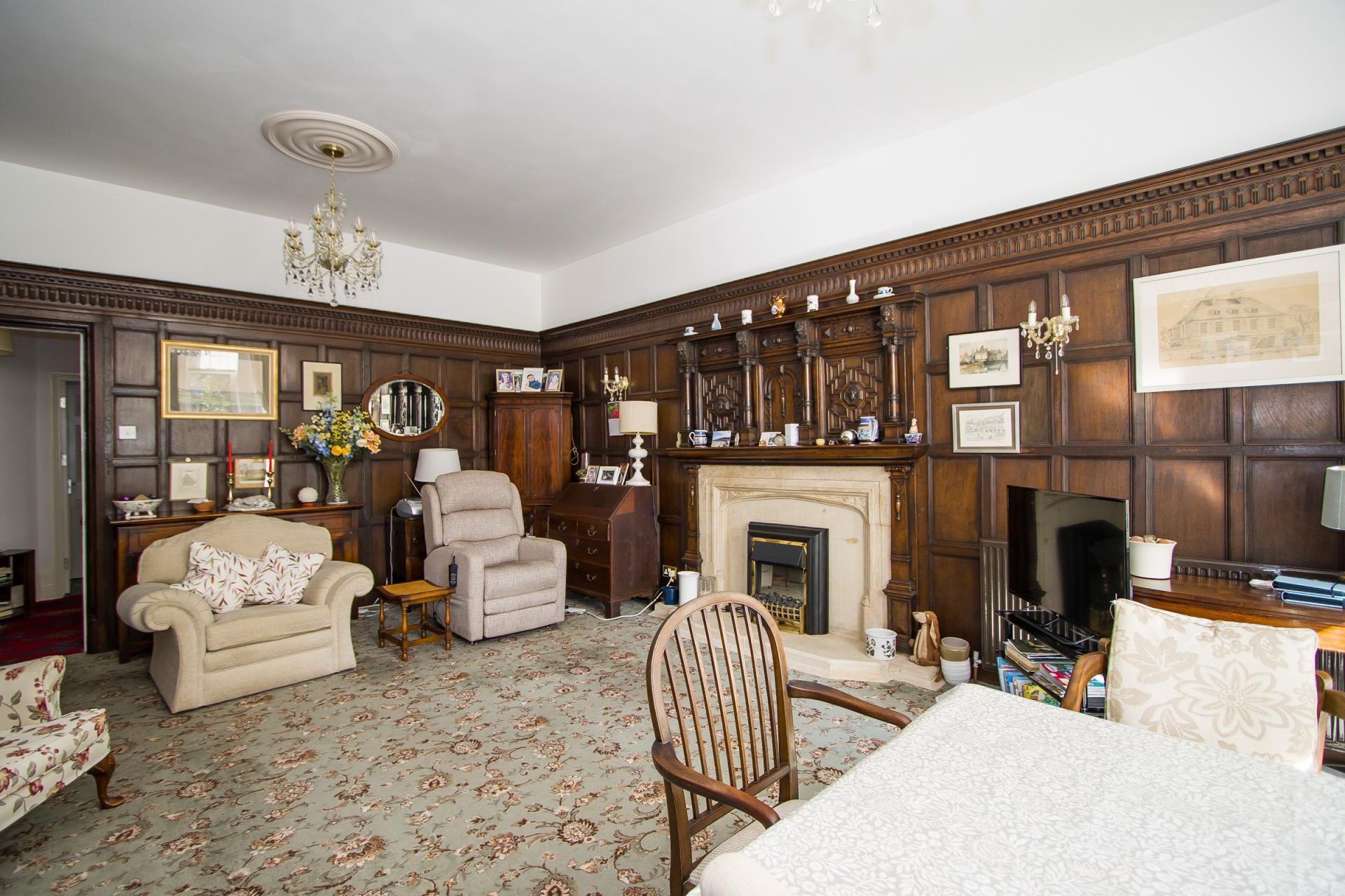 - Large, original wood-panelled living room