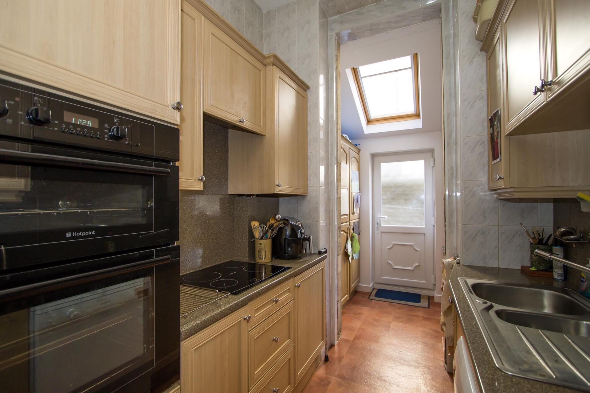Vinyl flooring continued from the kitchen. Fitted wall units and base units with laminate work surfaces and breakfast bar with matching splashbacks. Original exposed stone wall. Velux window and uPVC double glazed window to the side. Plumbing for washing machine and dryer. Single bowl stainless steel sink. Power points. Back door that leads to the garden, which has a small store.