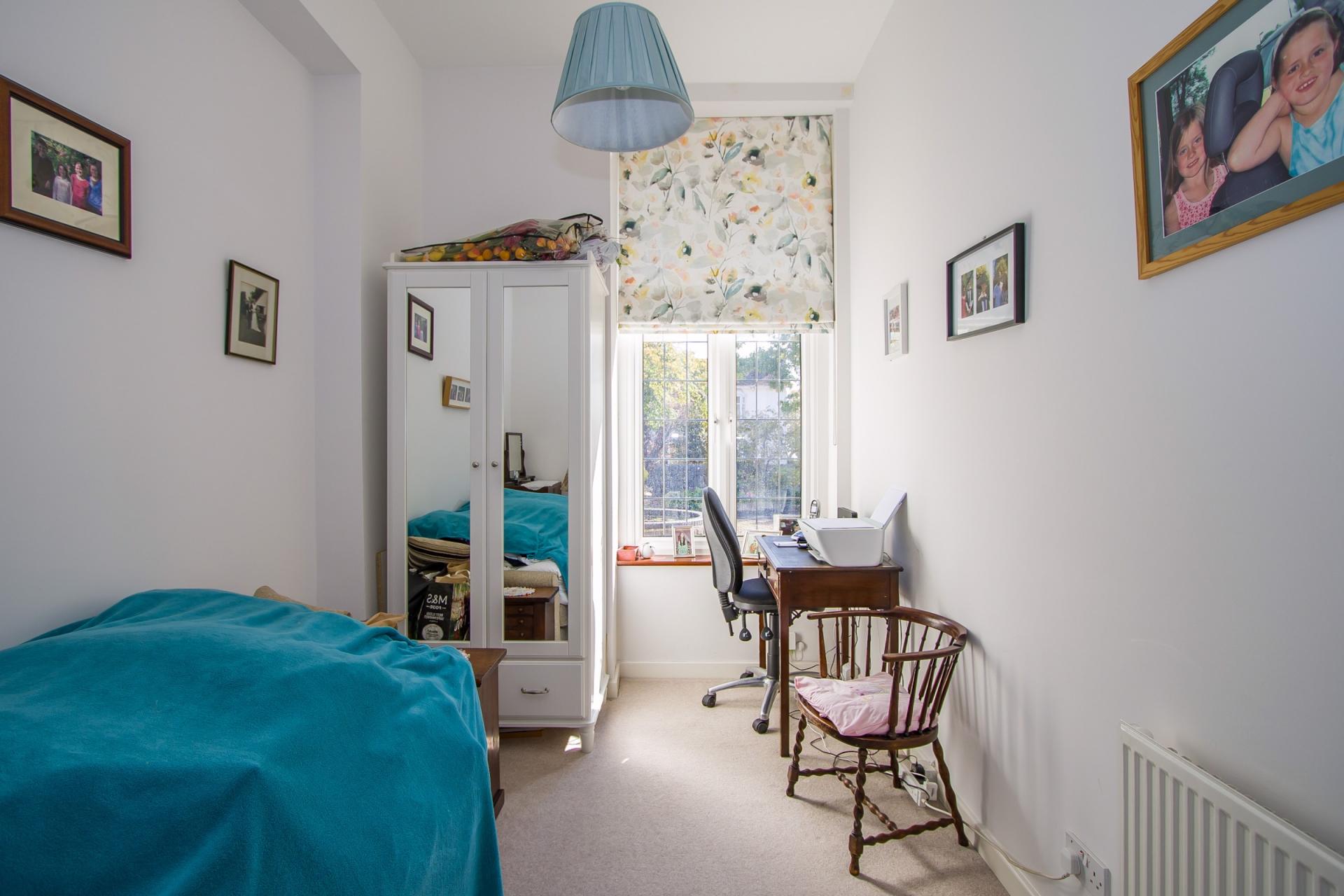 A well-proportioned bedroom, ideal as a home office or even as a cosy TV snug depending on your requirements. Fitted carpet. uPVC double glazed window to the front onto the communal garden. Central heating radiator. Power points.