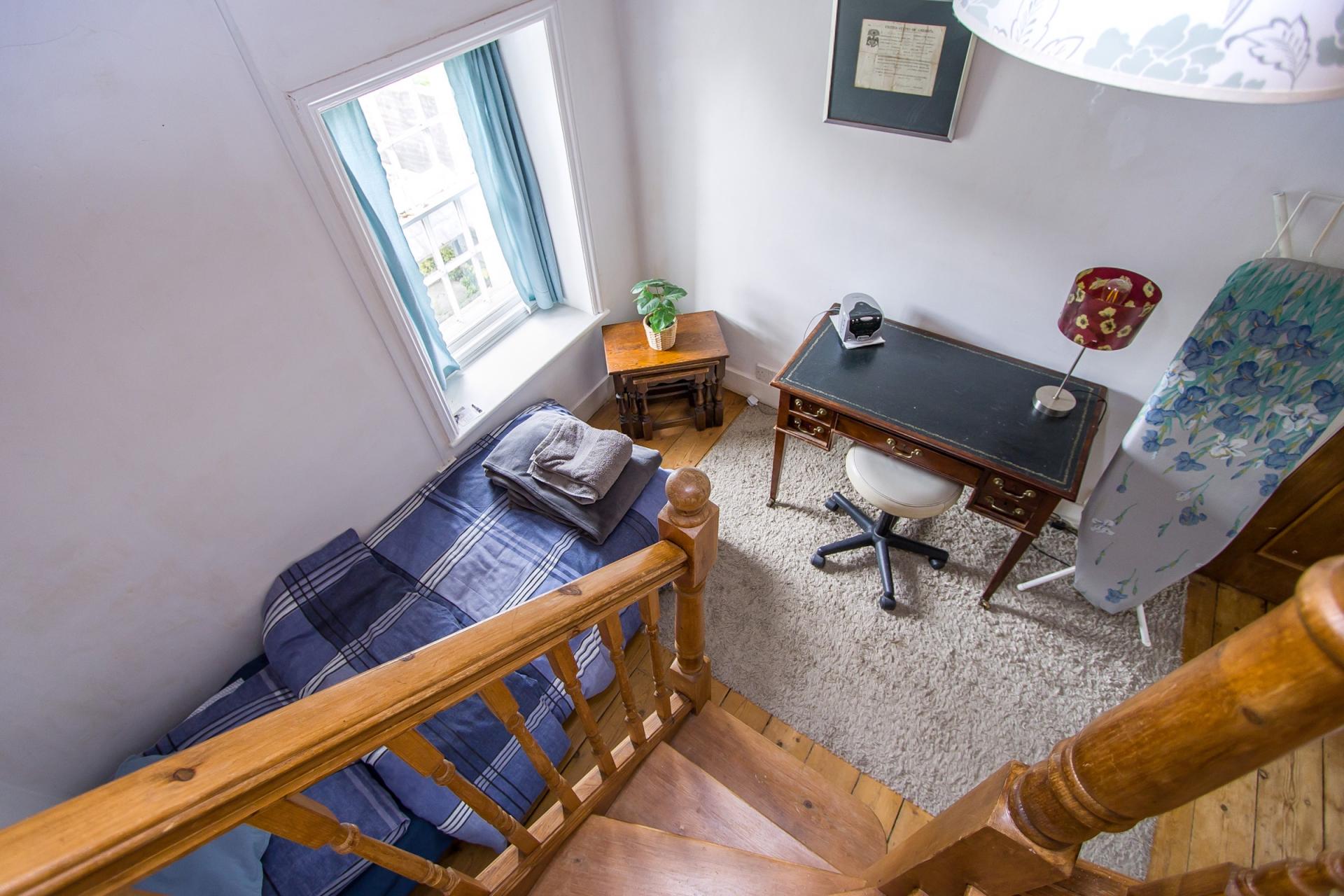 Single bedroom, but a good size, and with original timber floor and wooden sash window. Period style fireplace. Stairs to the loft room. Fitted shelving. Power points. Central heating radiator.