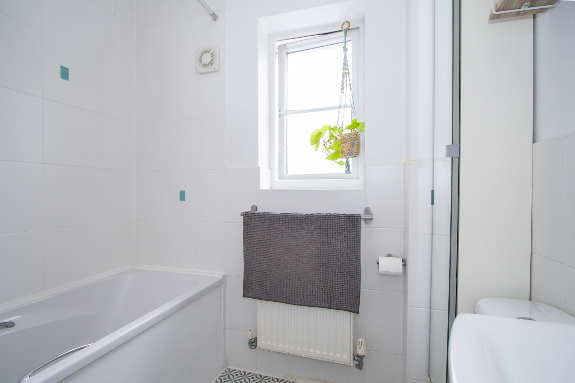 Vinyl flooring. Suite comprising a panelled bath with mixer shower, a WC and a sink with storage below. Part tiled walls. Shaver point. Recessed lighting. uPVC double glazed window to the rear. Central heating radiator. Extractor fan.