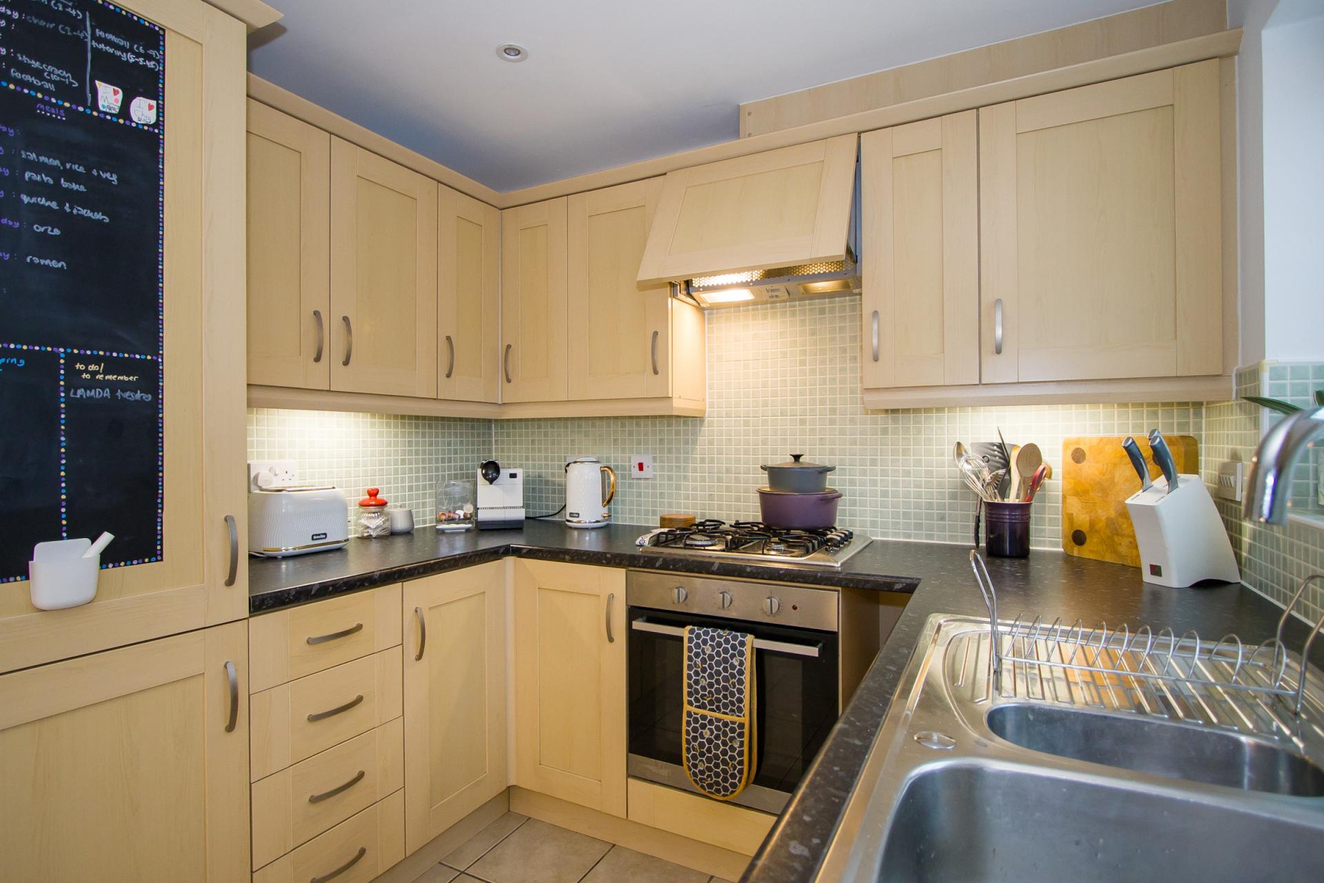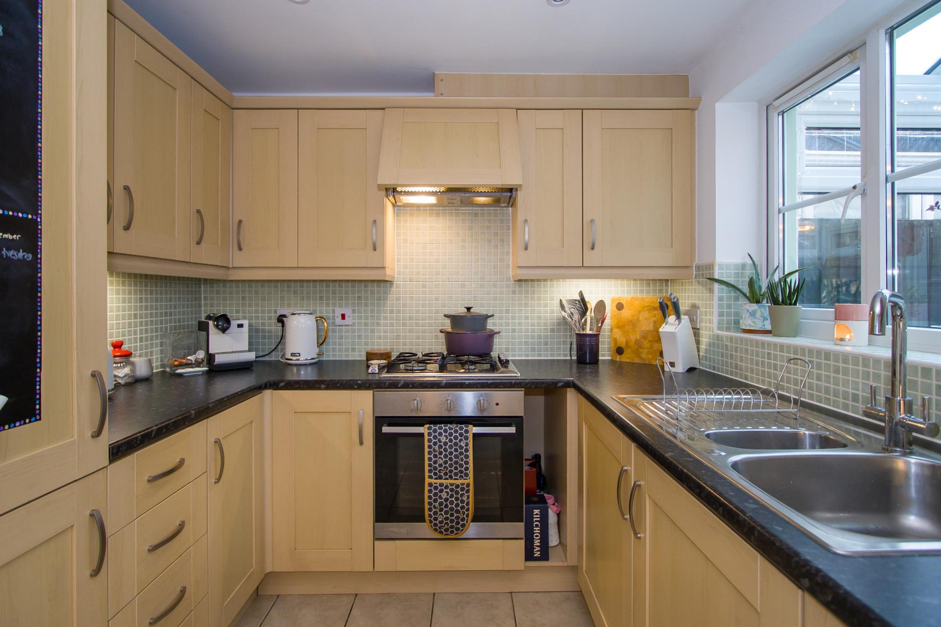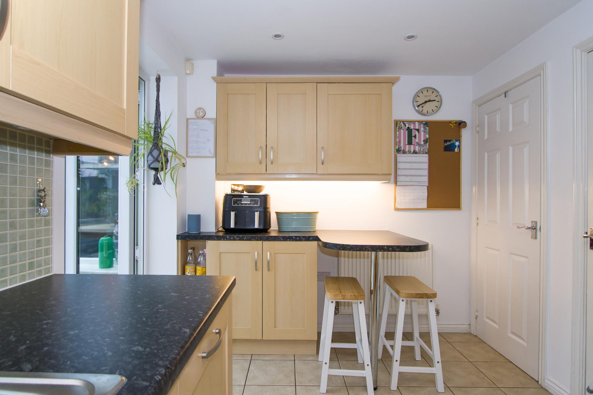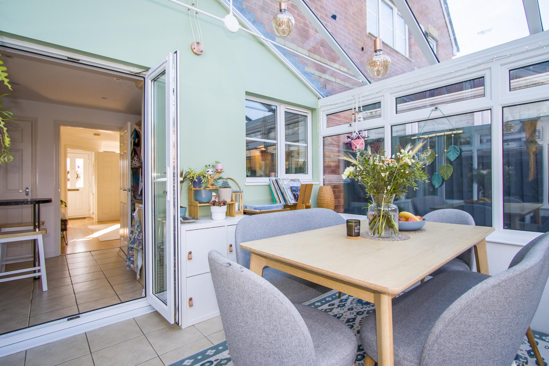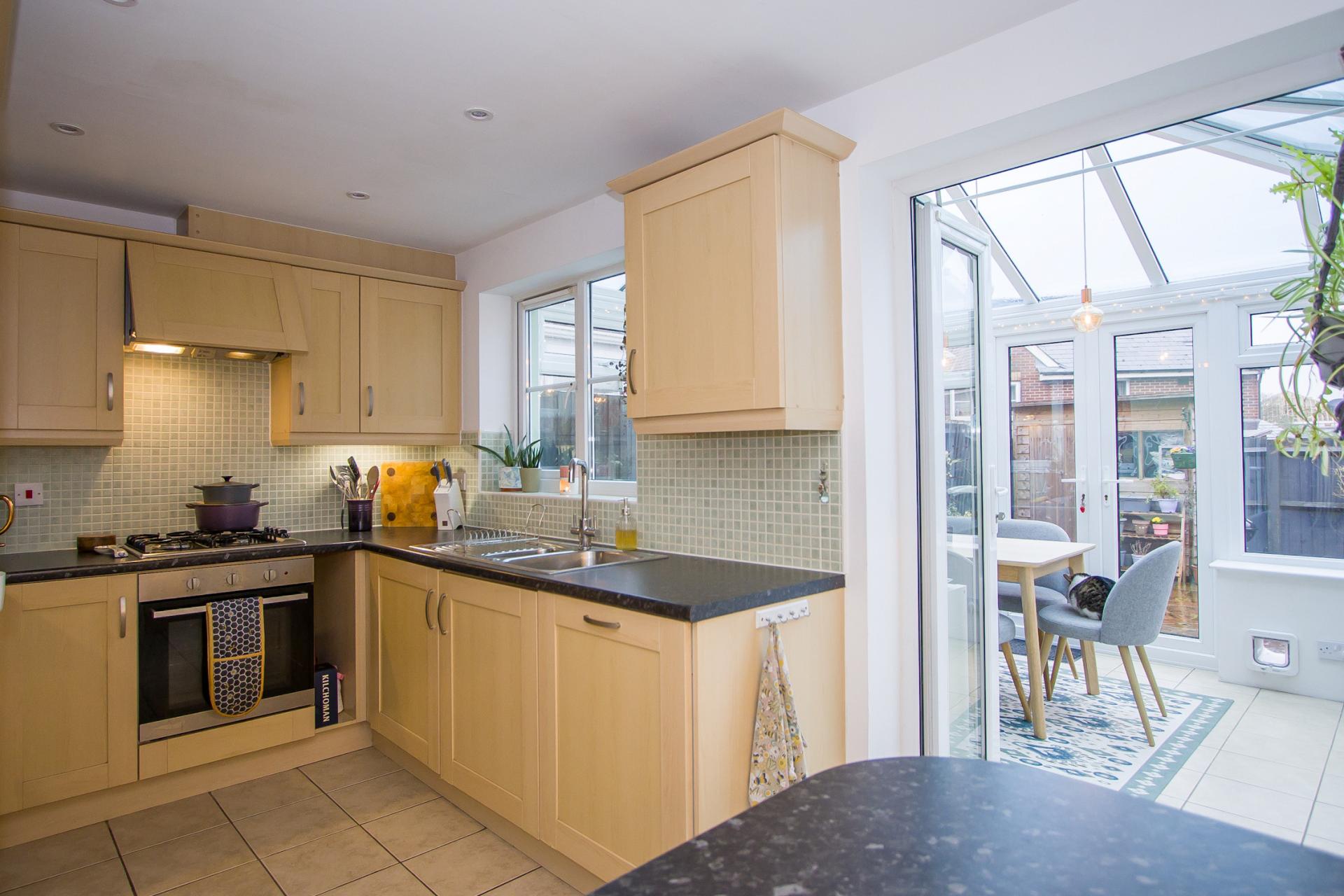 A kitchen with dining space and access straight into the conservatory and out to the garden. Tiled flooring. Fitted kitchen comprising wall units and base units with shaker style doors and laminate work surfaces. Integrated appliances including an electric oven, four burner gas hob, extractor hood, fridge freezer, dishwasher and washing machine. One and a half bowl stainless steel sink with drainer. Part tiled walls. uPVC double glazed doors and window into the conservatory. Recessed lights. Built-in under stair cupboard with fitted shelving and power points. Central heating radiator.