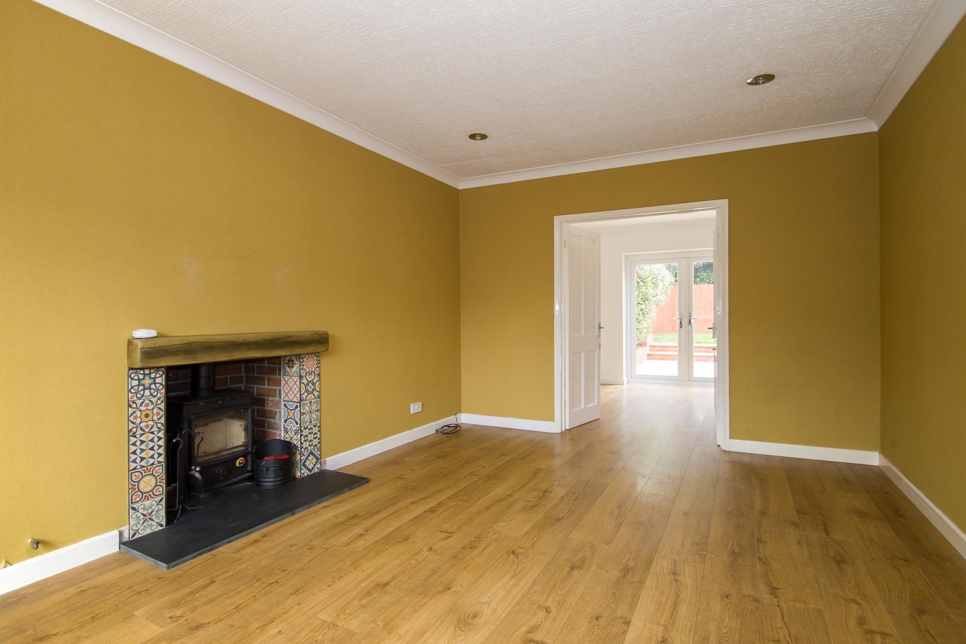 A spacious main living room with uPVC double glazed leaded windows to the front, wood burning stove and double doors to the rear into the kitchen / diner. Wood effect laminate flooring. Central heating radiator. Power points, phone and TV points. Coved ceiling. Recessed lights.