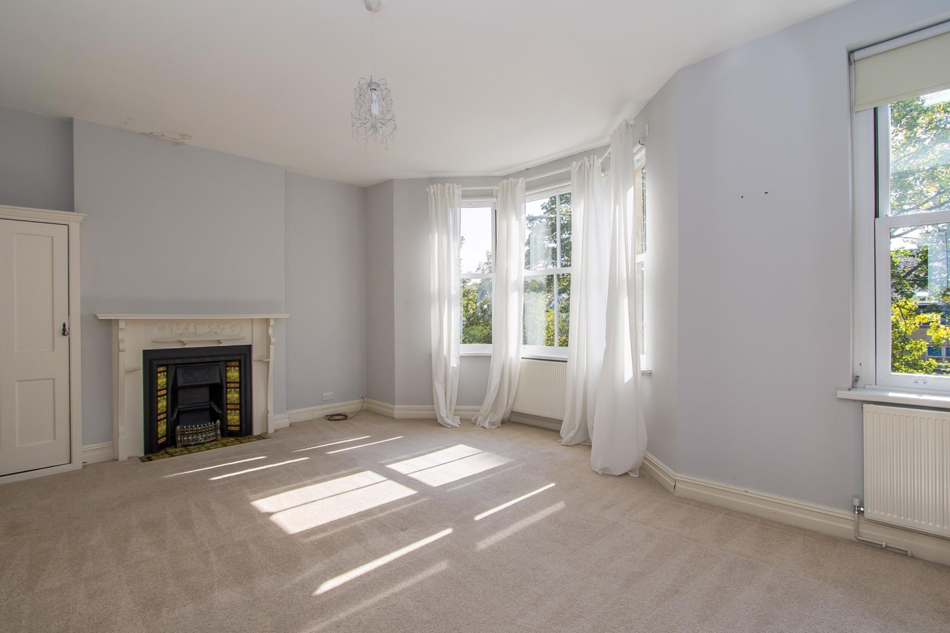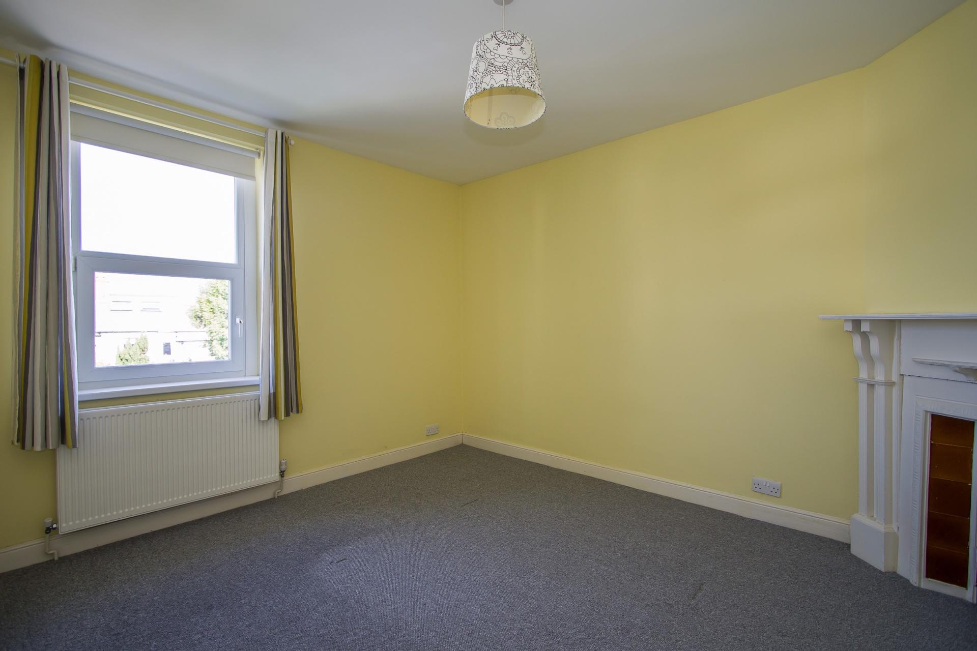 A spacious bedroom across the full width of the front of the house. Fitted carpet. uPVC double glazed sash bay window and additional window. Two central heating radiators. Original fireplace with cast iron grate, wooden surround and tiled hearth.