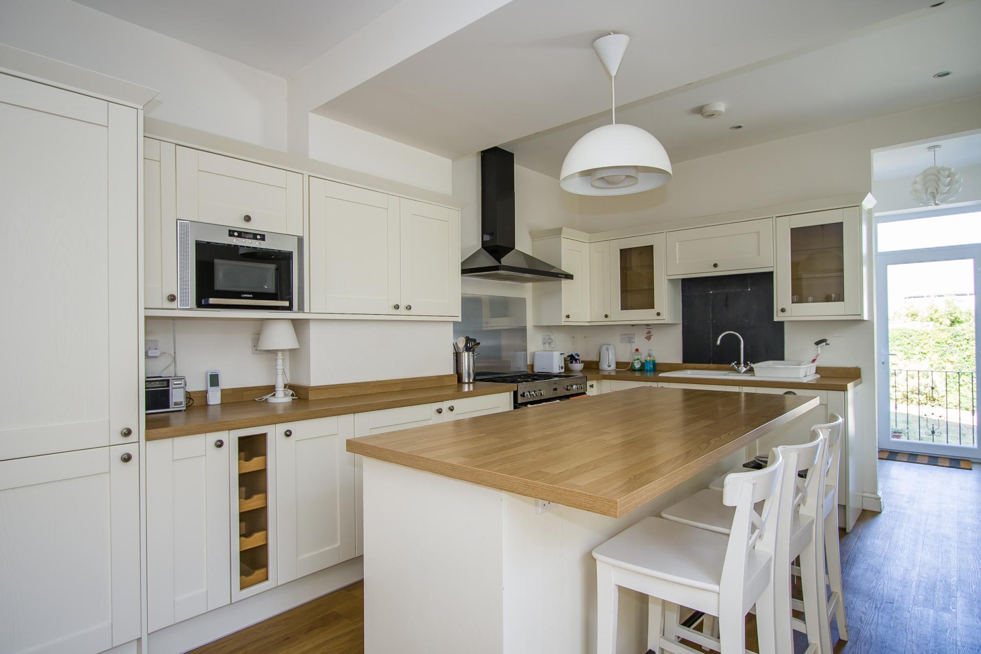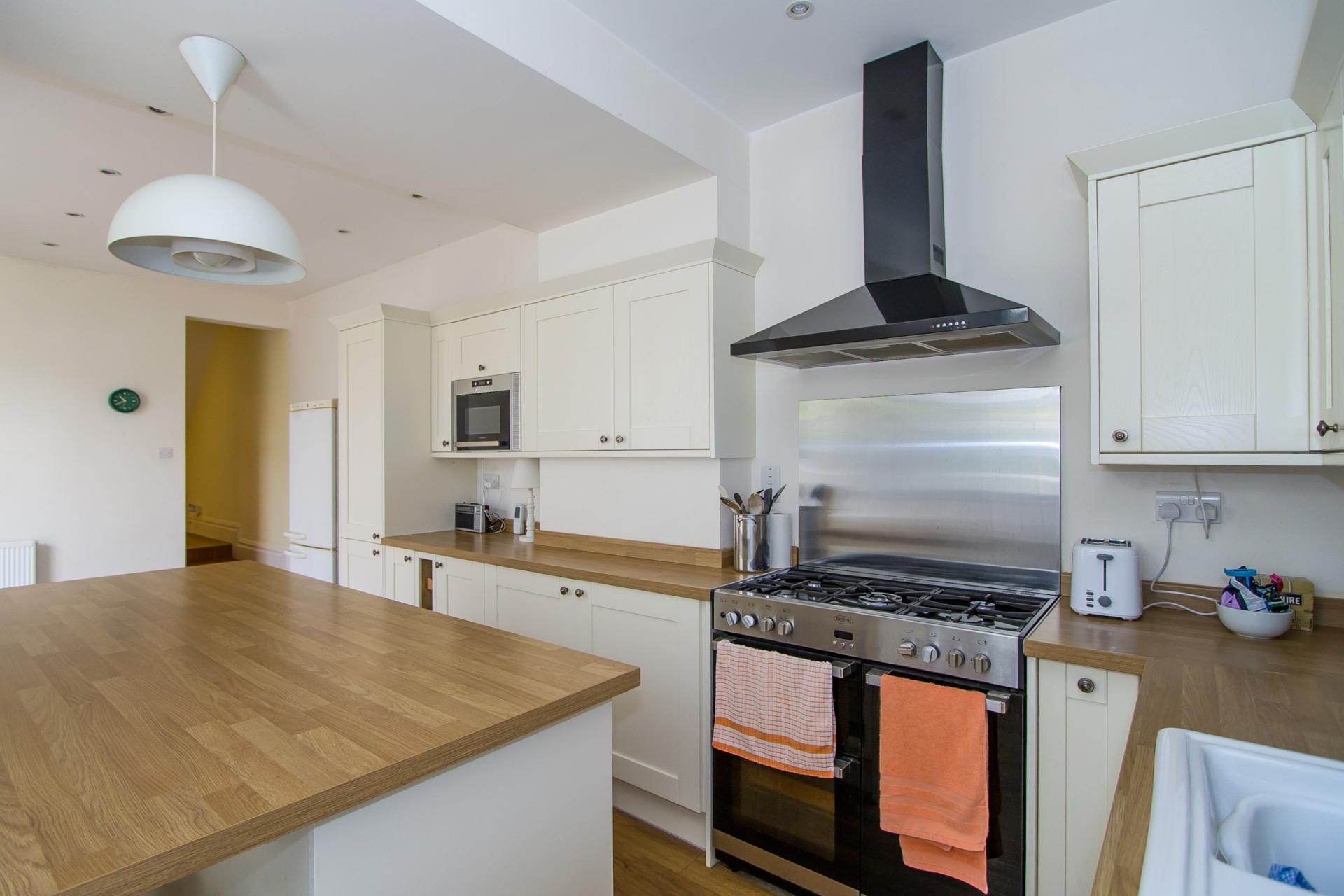 A light, spacious kitchen with orangery to the side. Wood effect LVT flooring. Fitted kitchen comprising wall units, base units and a central island and breakfast bar, all with cream shaker style doors and wood effect laminate work surfaces. Range cooker with five burner gas hob, double oven and grill. Fitted extractor hood over. Integrated dishwasher and microwave oven. Freestanding fridge freezer. One and a half bowl ceramic sink with drainer and slate splashback. Recessed lights. Power points. Two central heating radiators. Open to the orangery at the side, and access to the boiler room and rear garden.