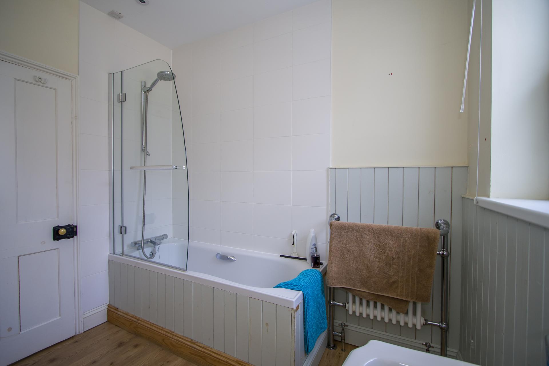 Wood effect laminate floor. Suite comprising a panelled bath with mixer shower and glass screen, WC and pedestal sink. Heated towel rail. Two uPVC double glazed windows to the side. Recessed lighting. Extractor fan. Part timber clad walls, part tiled.