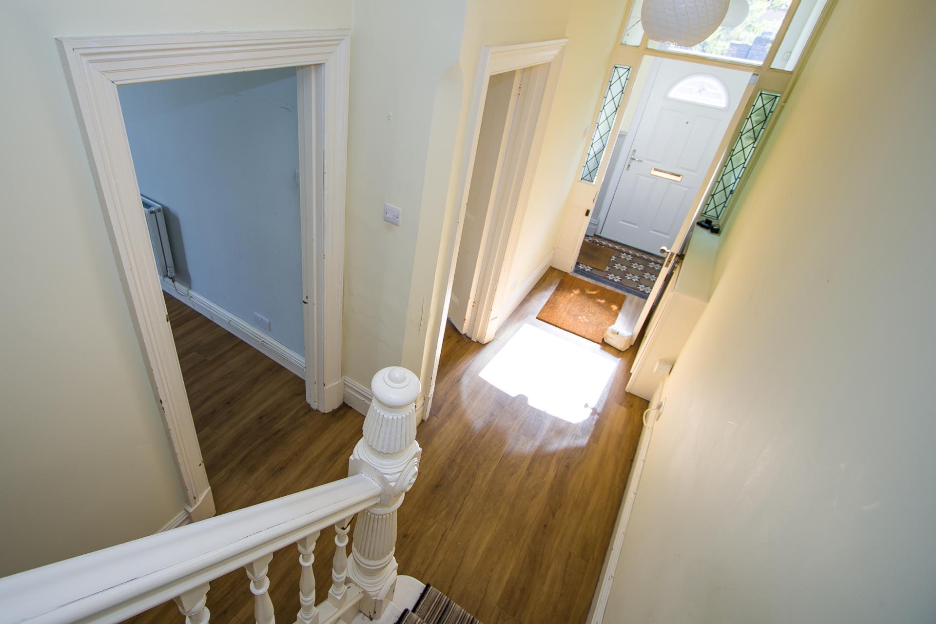Composite front door with double glazed panel and window above. Original wood panelled walls and tiled floor. Original wooden inner doors with leaded glass panels.