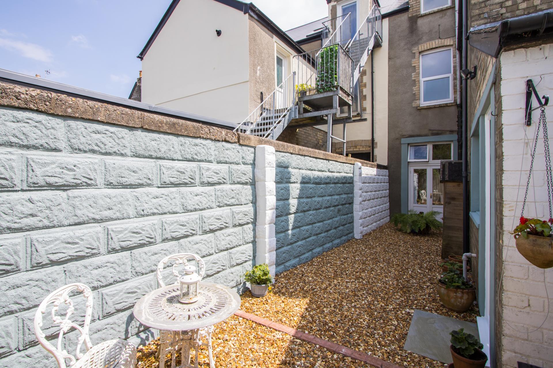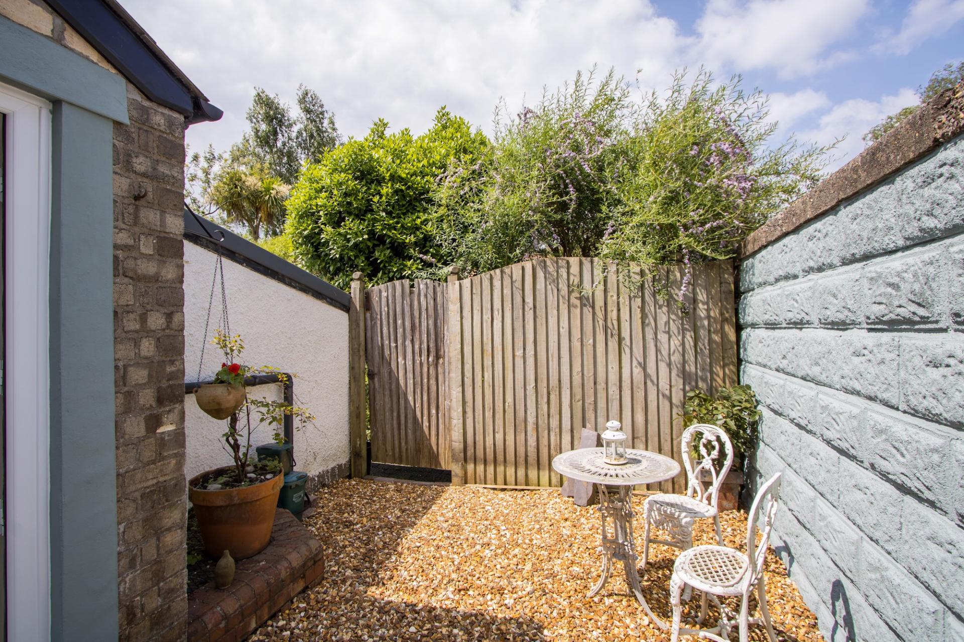 An enclosed rear courtyard style garden laid to stone chippings and with a westerly aspect. Outside lights. This area provides very useful and versatile additional space to the main front garden.