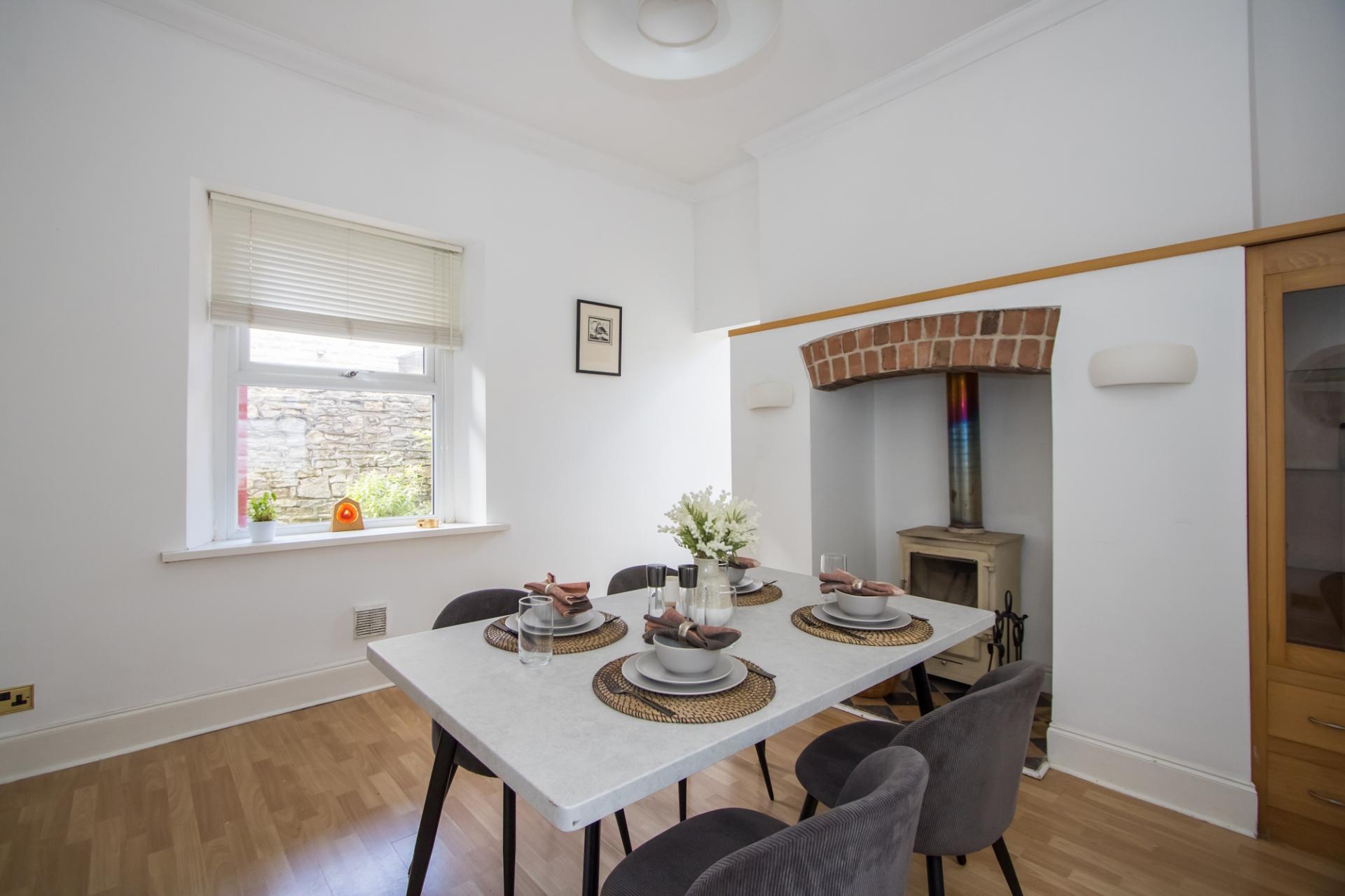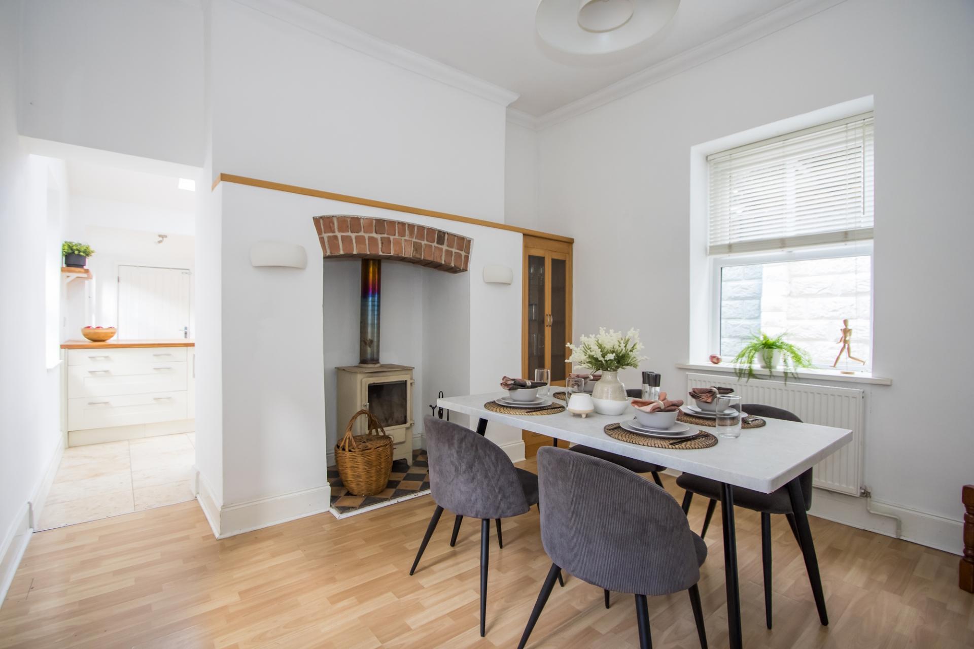 Accessed from the hallway through a set of timber glazed panel double doors. uPVC triple glazed windows to either side. Chimney breast with wood burning stove and fitted cupboard to the side. Central heating radiator. Power points. Open to the kitchen.