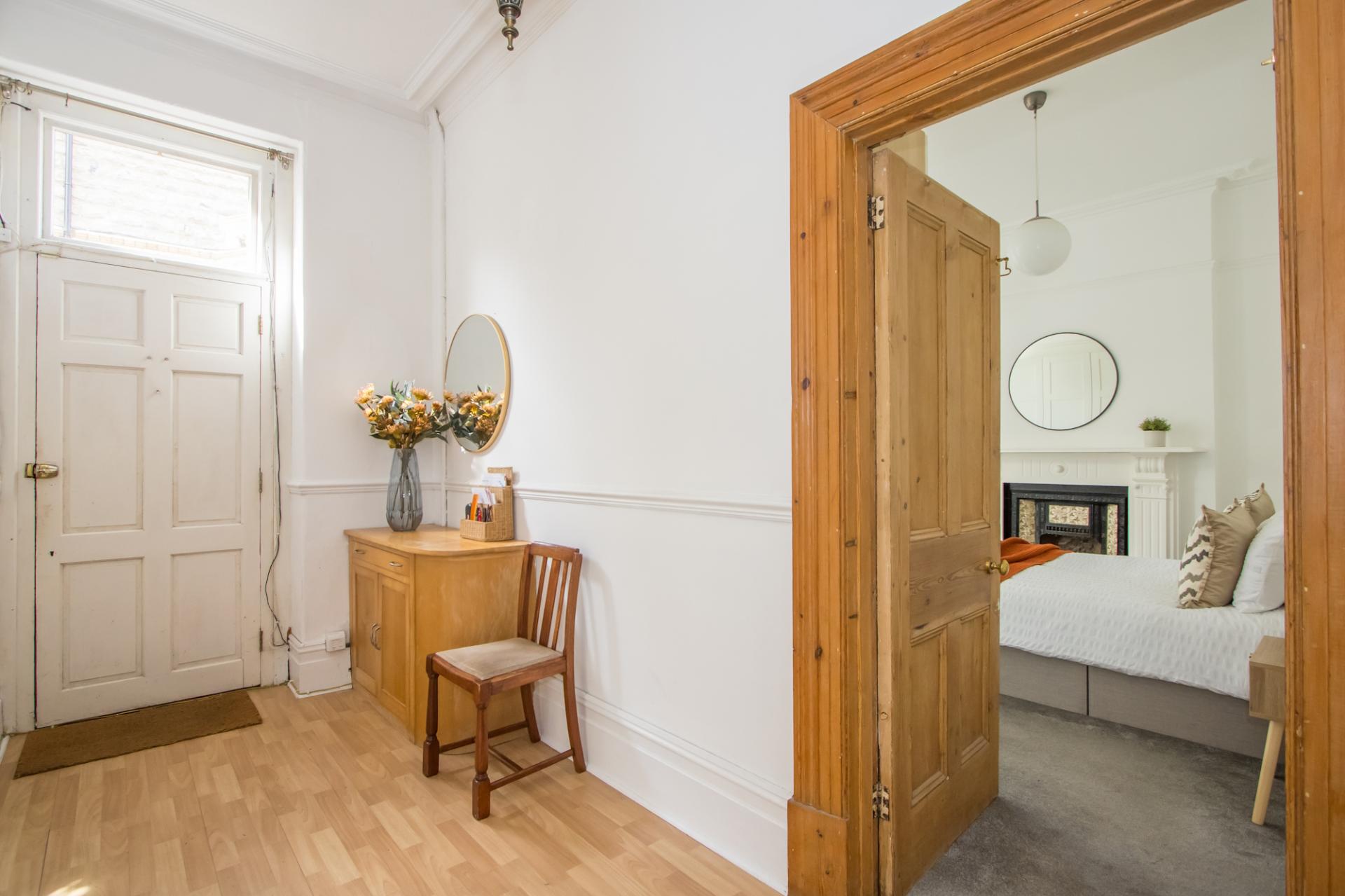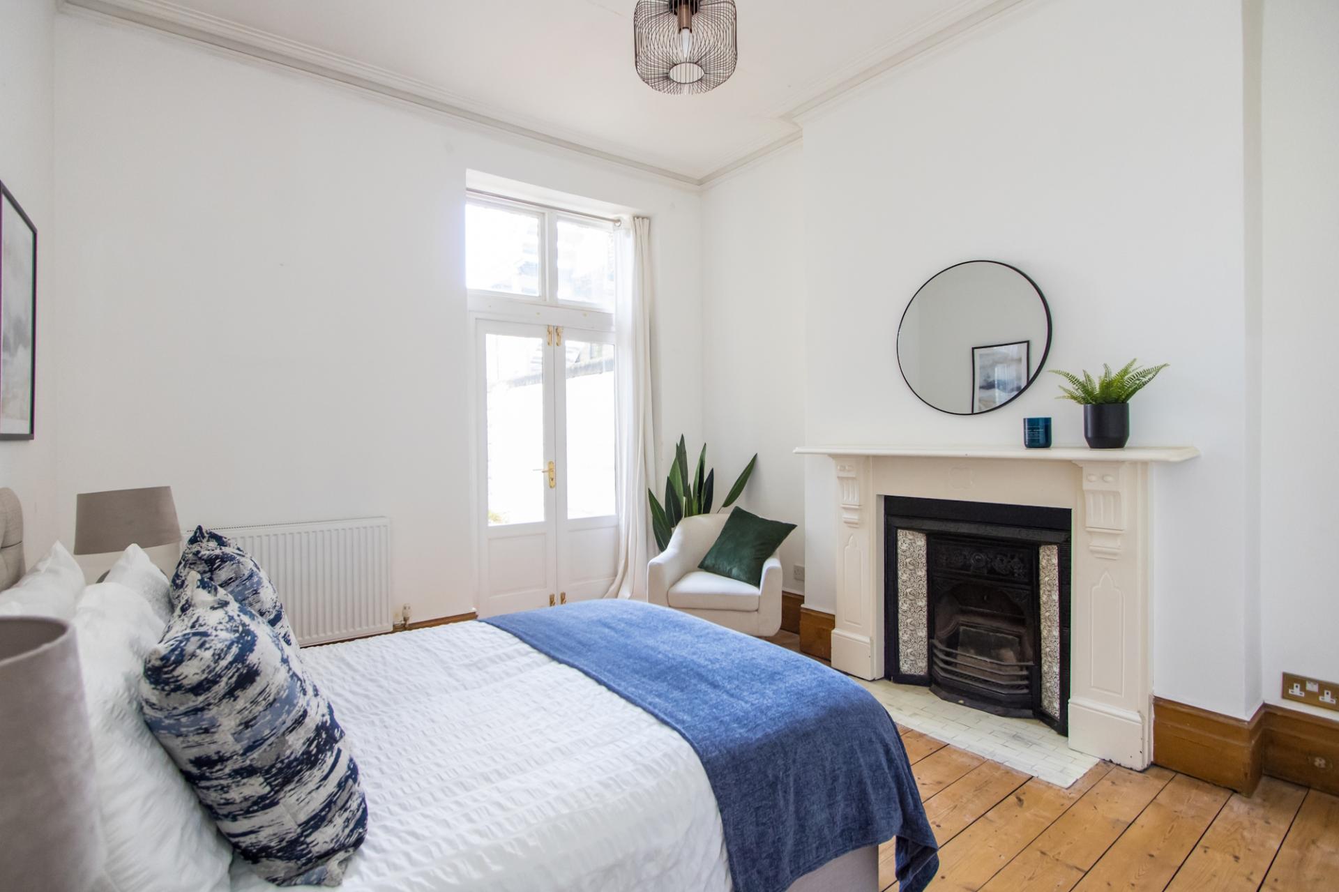 An pleasant second bedroom with original timber flooring, fireplace, cornice and deep skirting boards. Wooden double glazed double doors out into the side return with windows above. Fitted wardrobes. Central heating radiator. Power points.