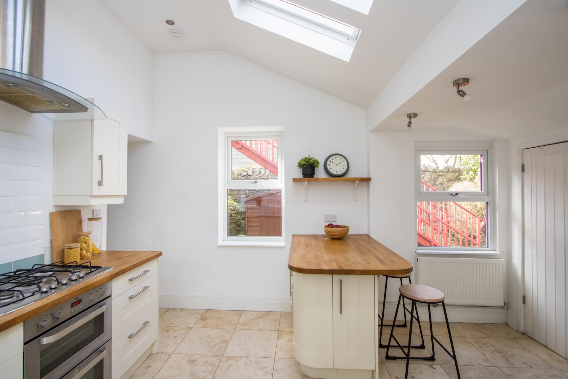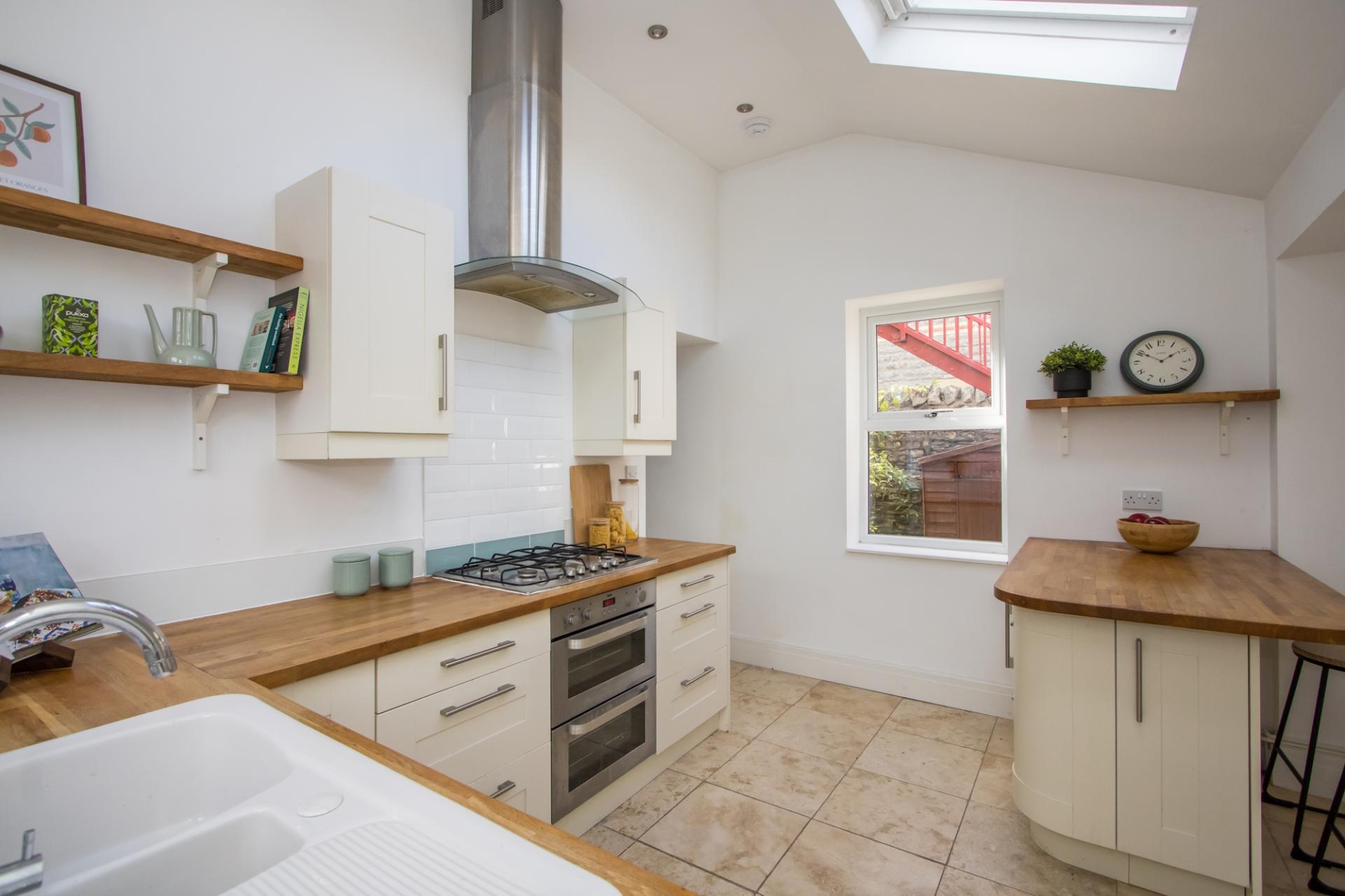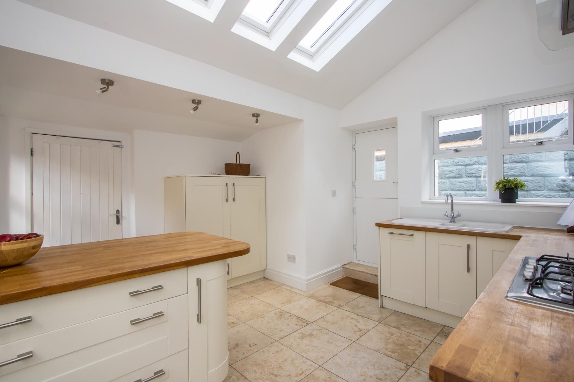 A very attractive, stylish kitchen with tiled floor and windows to two side, door into the garden and three Velux windows bringing in plenty of natural light. Fitted kitchen comprising wall units and base units with shaker style doors, wooden work surfaces and a matching peninsular unit / breakfast bar. Integrated appliances including a double electric oven, four burner gas hob, extractor hood, fridge and dishwasher. Central heating radiator. Recessed lights. Power points. Door to the utility room.