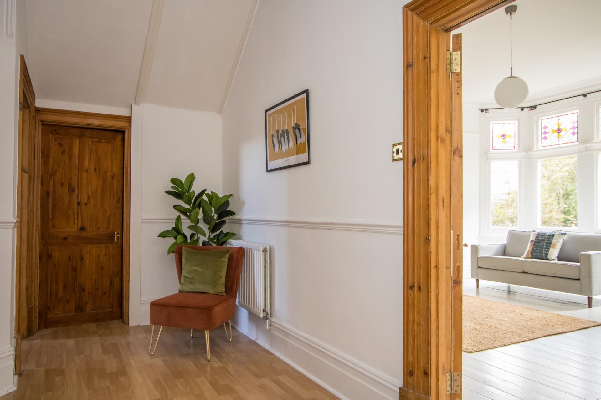 Wooden front door with window above. Wood effect laminate floor. Dado rails and original cornice, doors and deep skirting boards. Central heating radiator. Doors to the living room, bedrooms and storage room while opening into the dining room at the rear of the property.