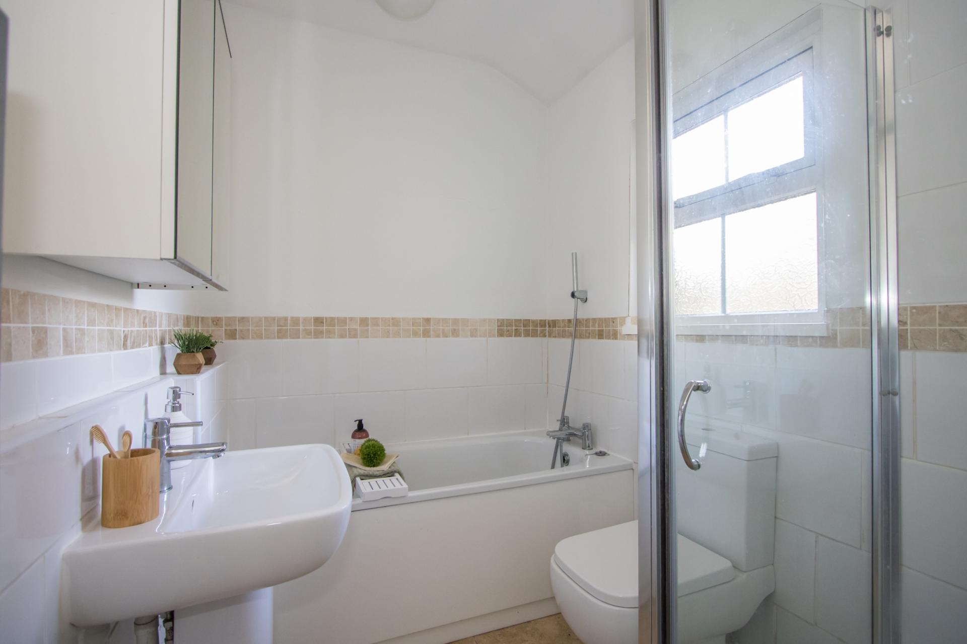 Tiled floor and part tiled walls. Suite comprising a panelled bathroom with hand shower fitment, shower cubicle and mixer shower, a WC and a wash hand basin. Heated towel rail. uPVC double glazed window to the rear. Extractor fan.