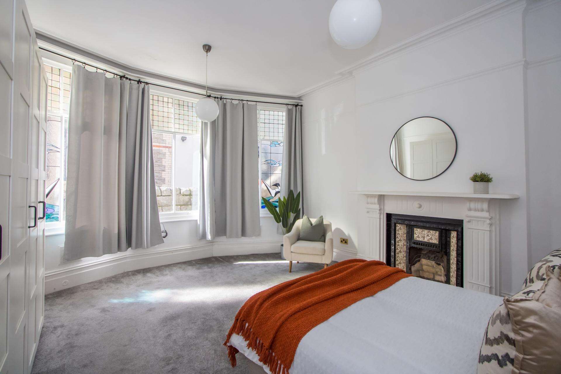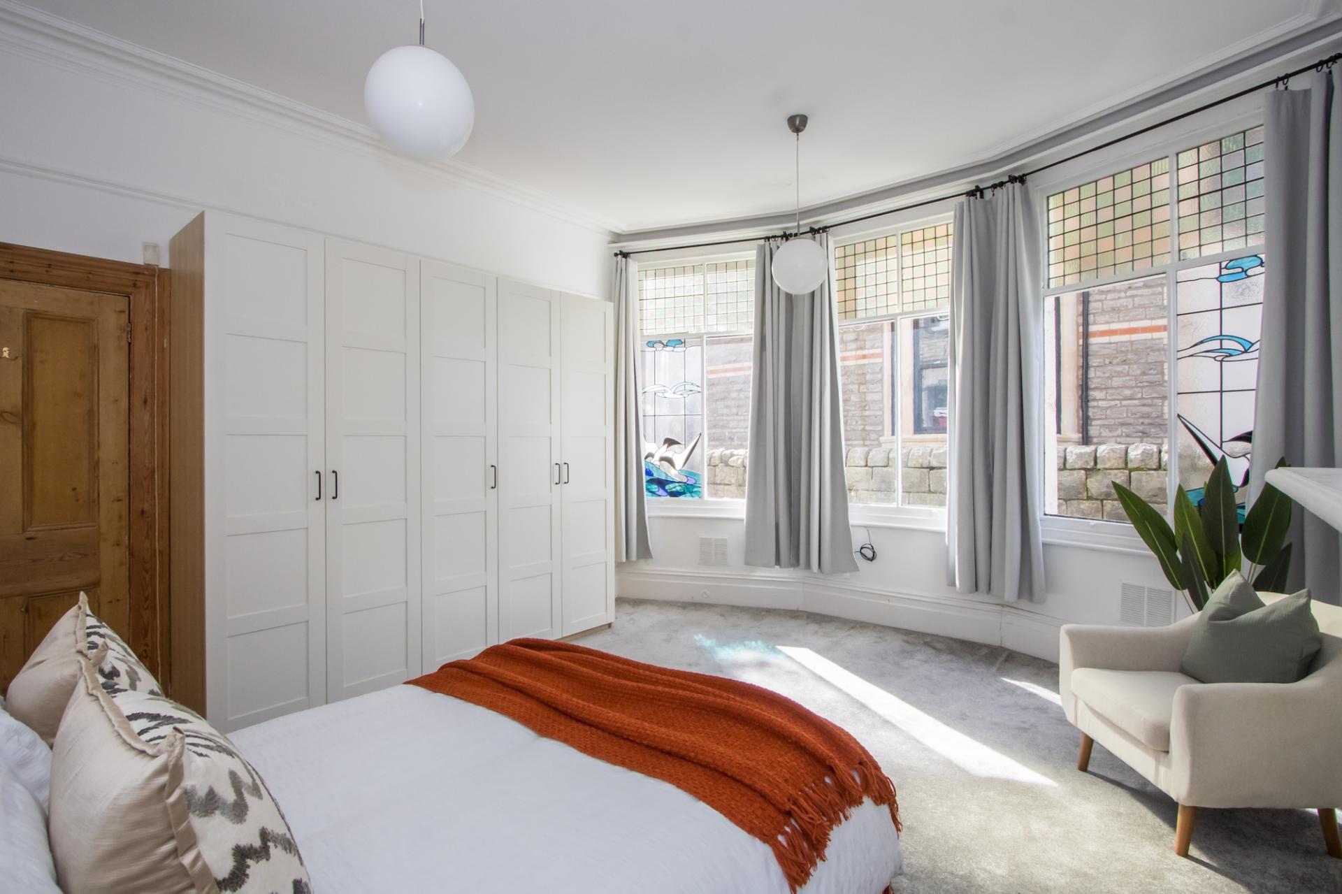 A large double bedroom with a very attractive original bay window to the side with stained glass. Original fire surround with cast iron fireplace and tiled hearth. Original cornice, picture rails and deep skirting boards. Fitted carpet. Central heating radiator. Power points. Fitted wardrobes.