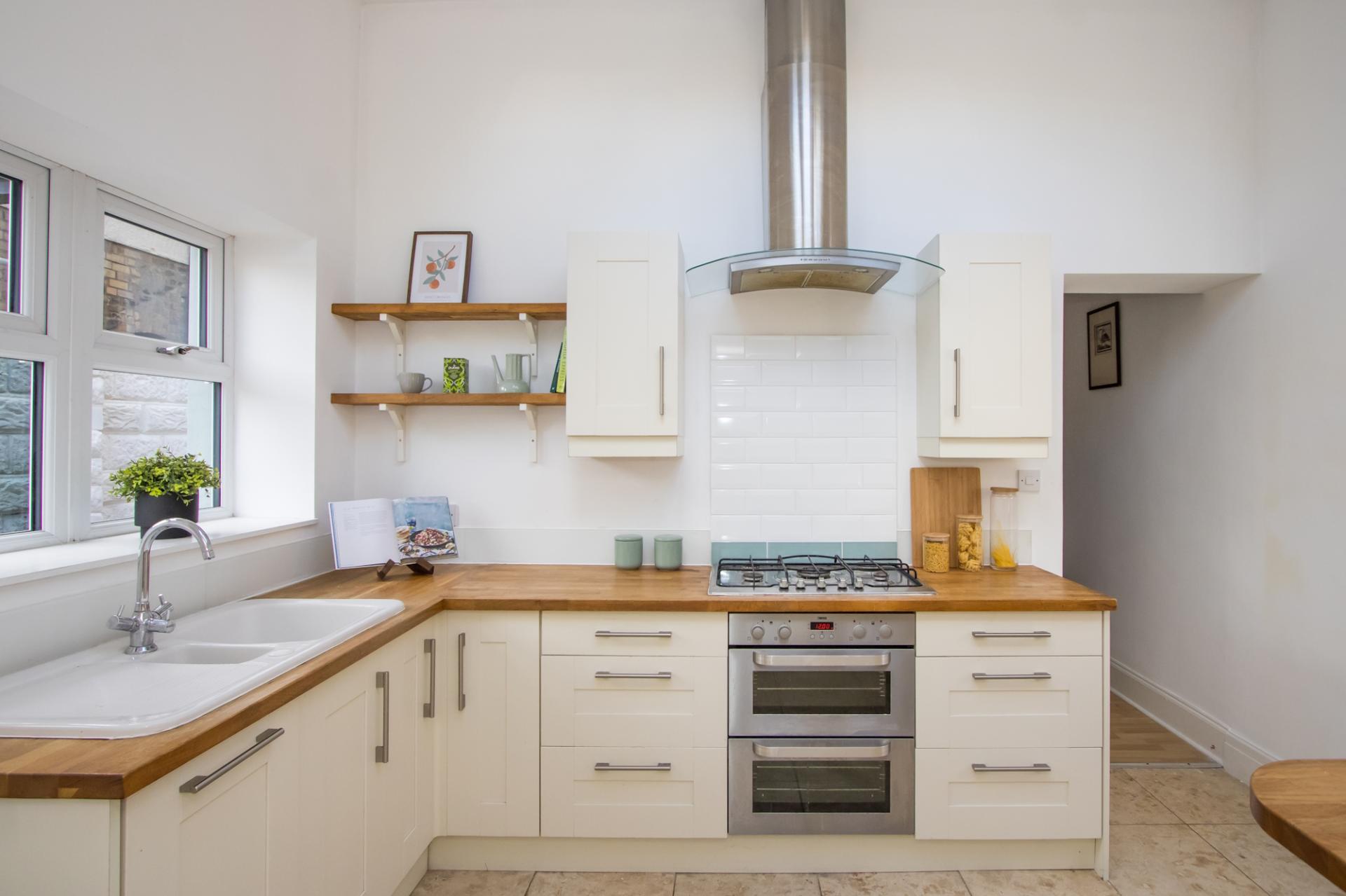 Tiled floor. Fitted laminate work surfaces and shelving. Plumbing for washing machine. Wall mounted Baxi gas combination boiler.