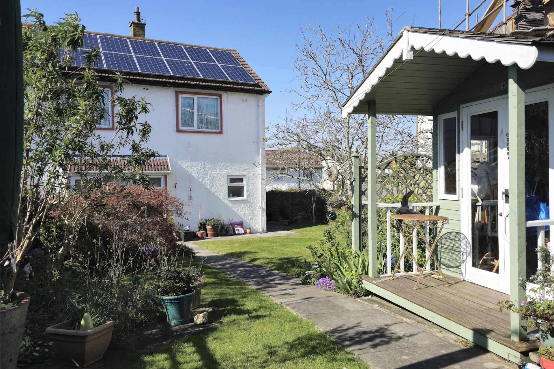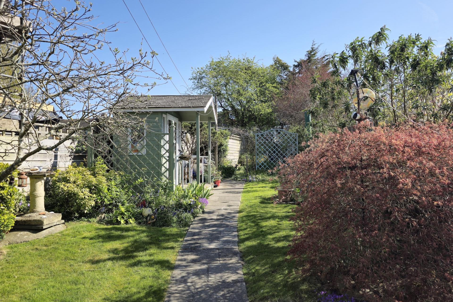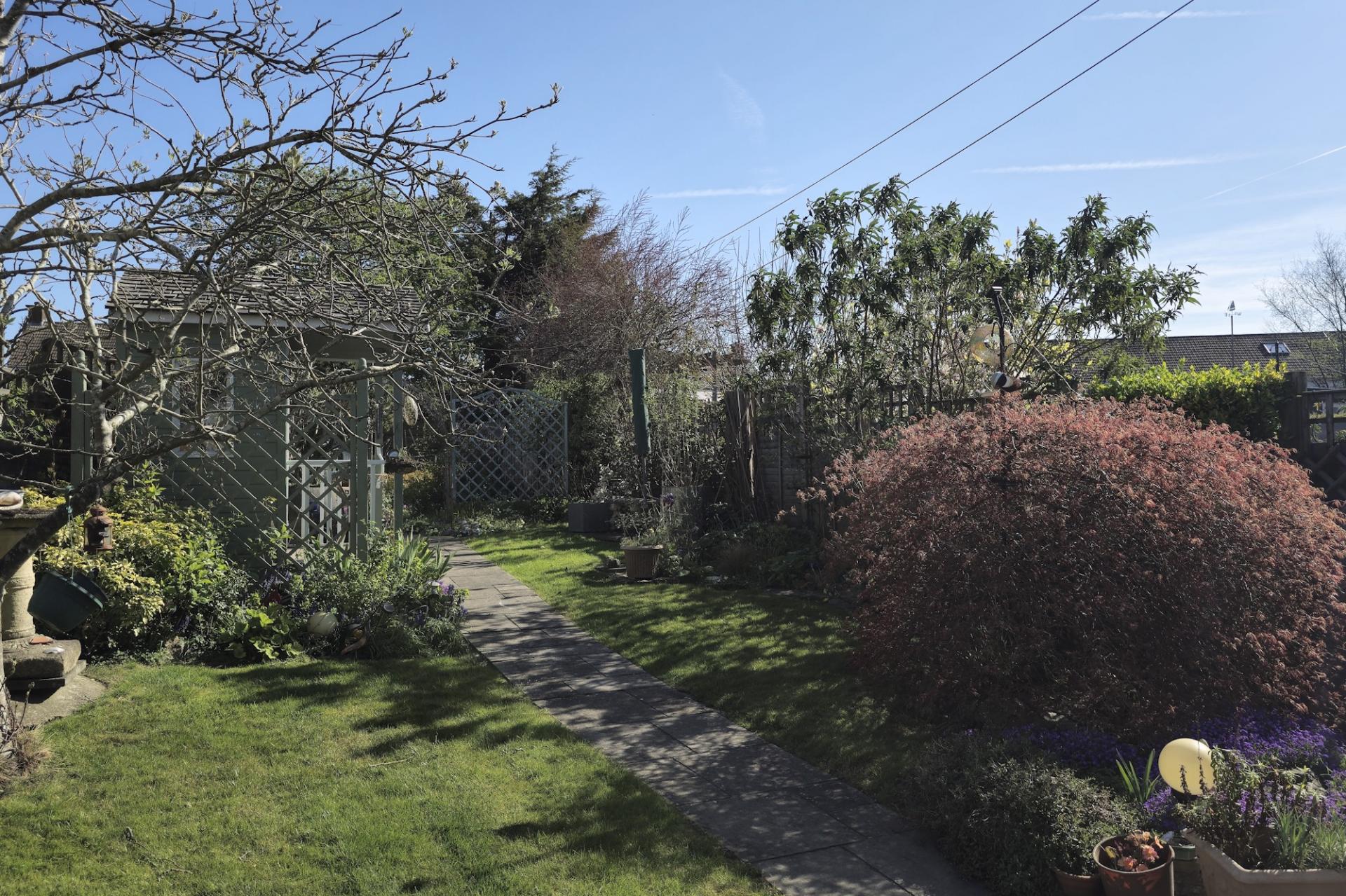 An enclosed rear garden with lawn patio. Timber summer house. Mature planting throughout. Gated access to the front. Outside tap.