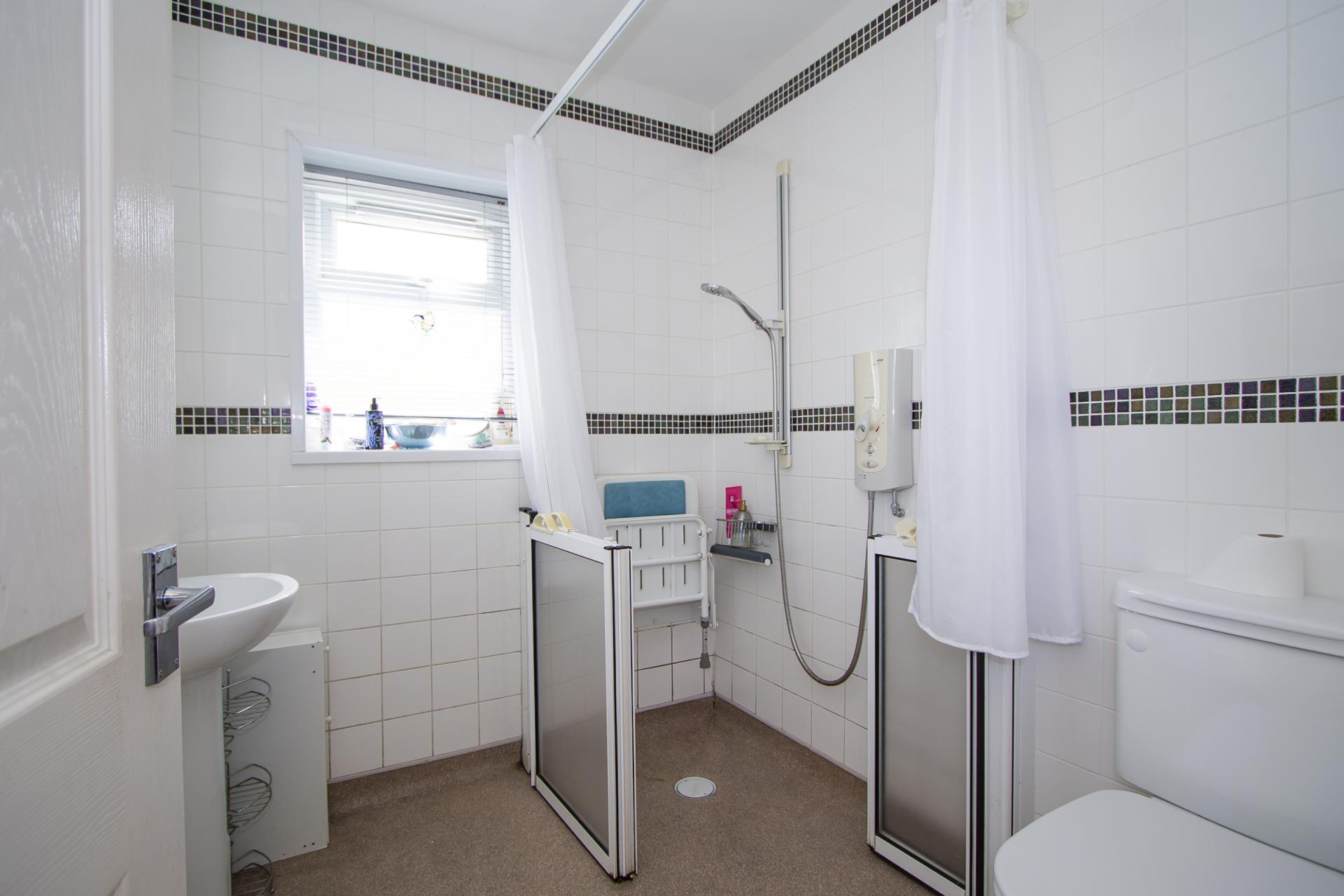 This is a wet room with vinyl flooring and tiled walls. Electric shower, WC and sink. uPVC double glazed window to the rear. Extractor fan. Central heating radiator.