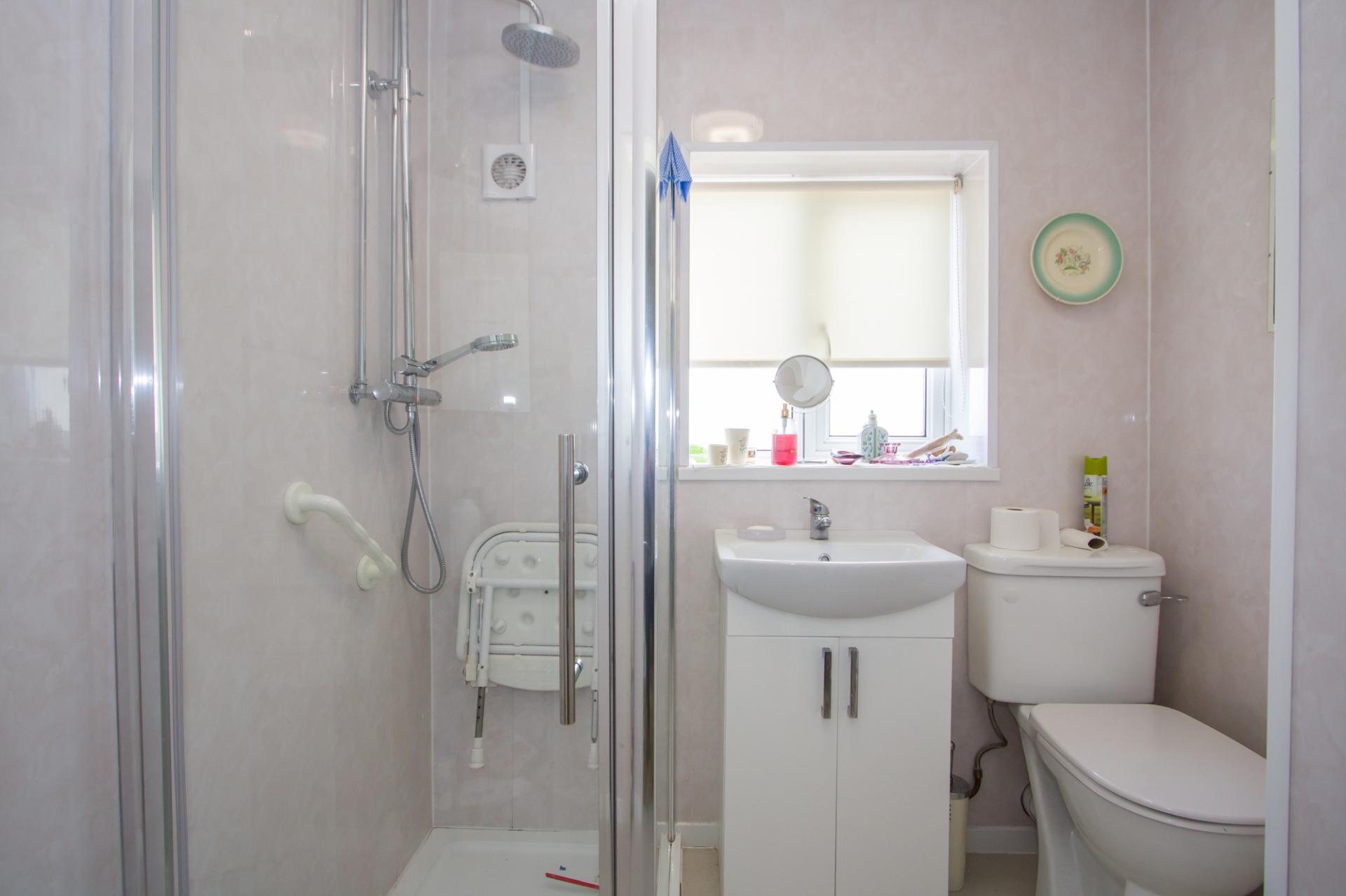 Vinyl floor and cladded walls. Suite comprising a shower cubicle with mixer shower, WC and sink with storage below. uPVC double glazed window to the side. Built-in cupboard with fitted shelving and gas combination boiler.