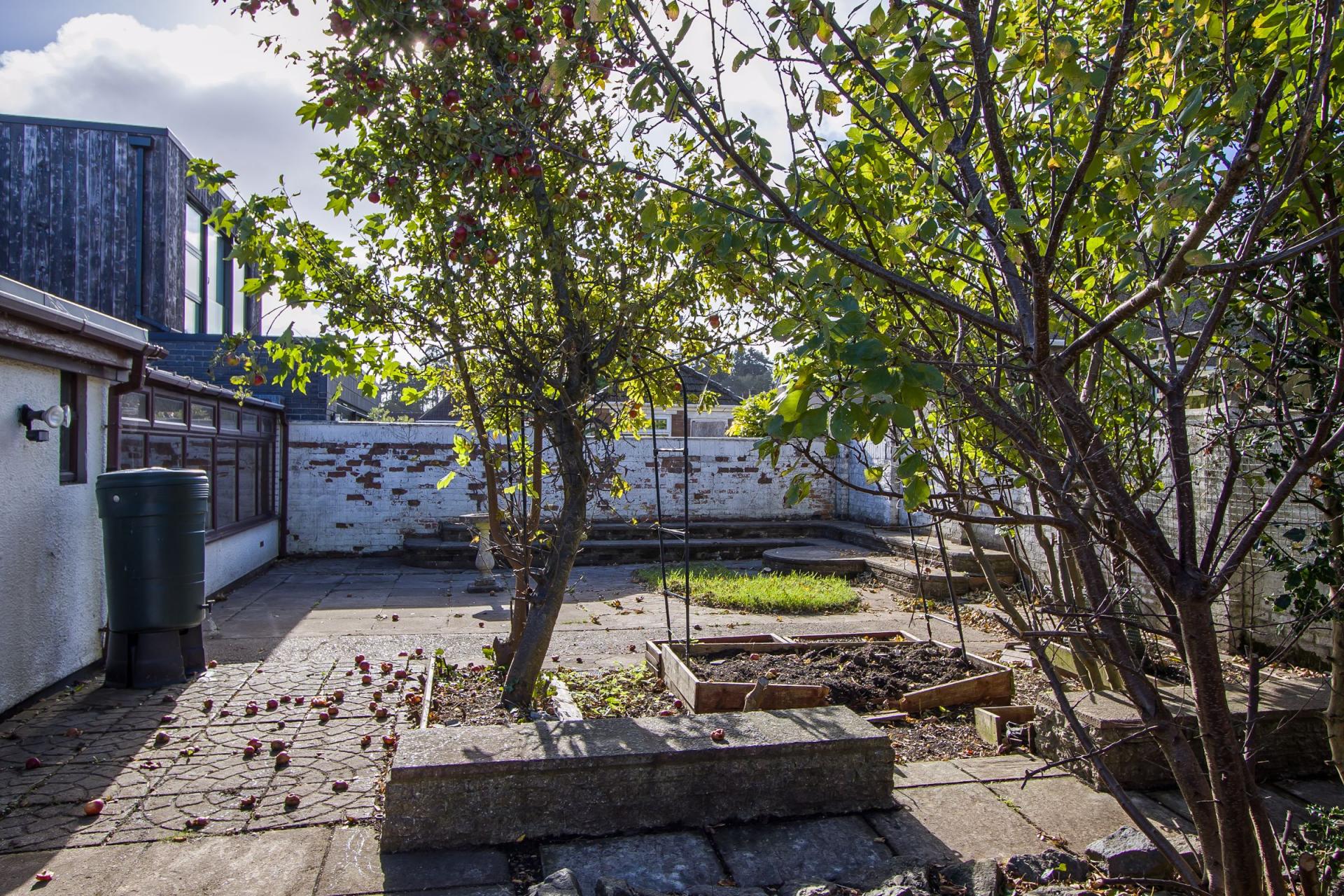 An enclosed rear garden with a south westerly aspect, laid to paving and with central planting beds and mature fruit trees. Garden shed.