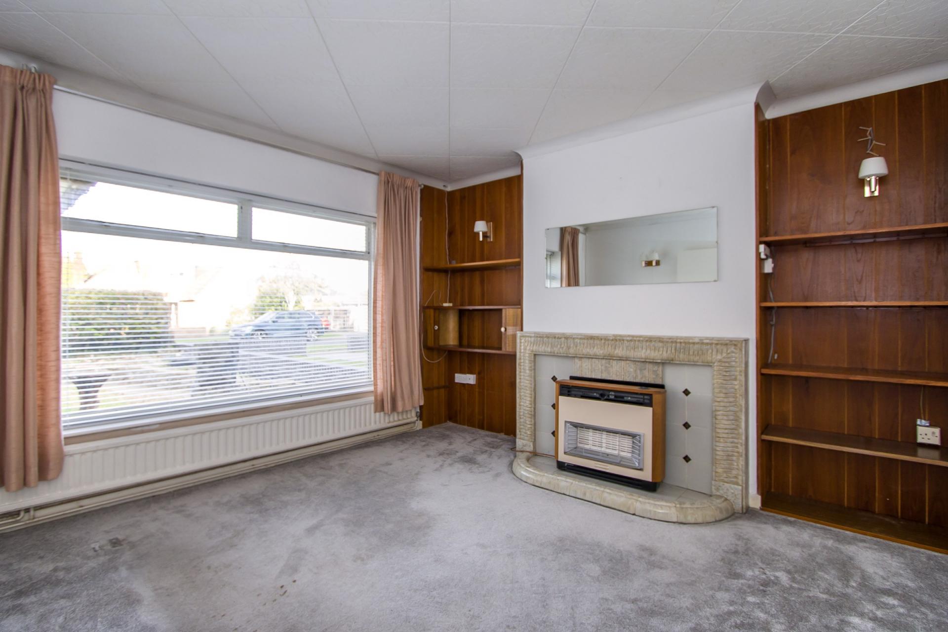 Fitted carpet. Large uPVC double glazed window to the front. Tiled fireplace with gas fire. Four fitted wall lights. Coved ceiling. Recess shelving. Power points and TV point.