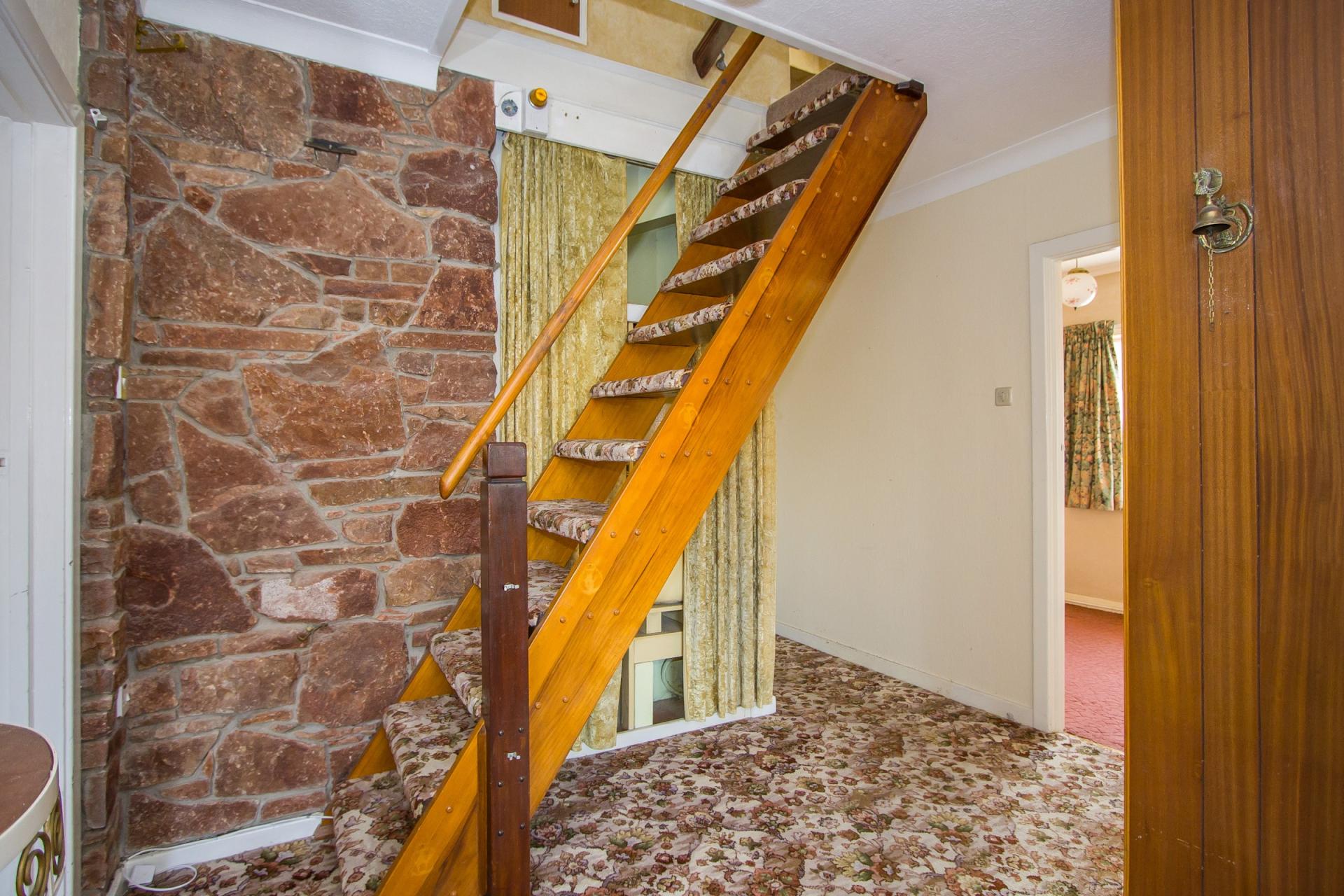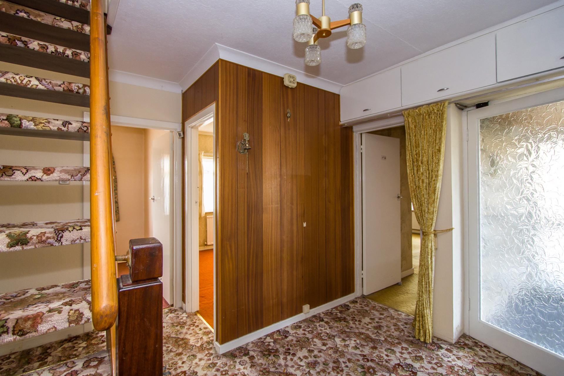 Fitted carpet. Stairs to the first floor. Central heating. Cupboard with hot water cylinder. Power point. Phone point. Doors to the living room, three bedrooms, bathroom and kitchen. Additional built-in cupboard.