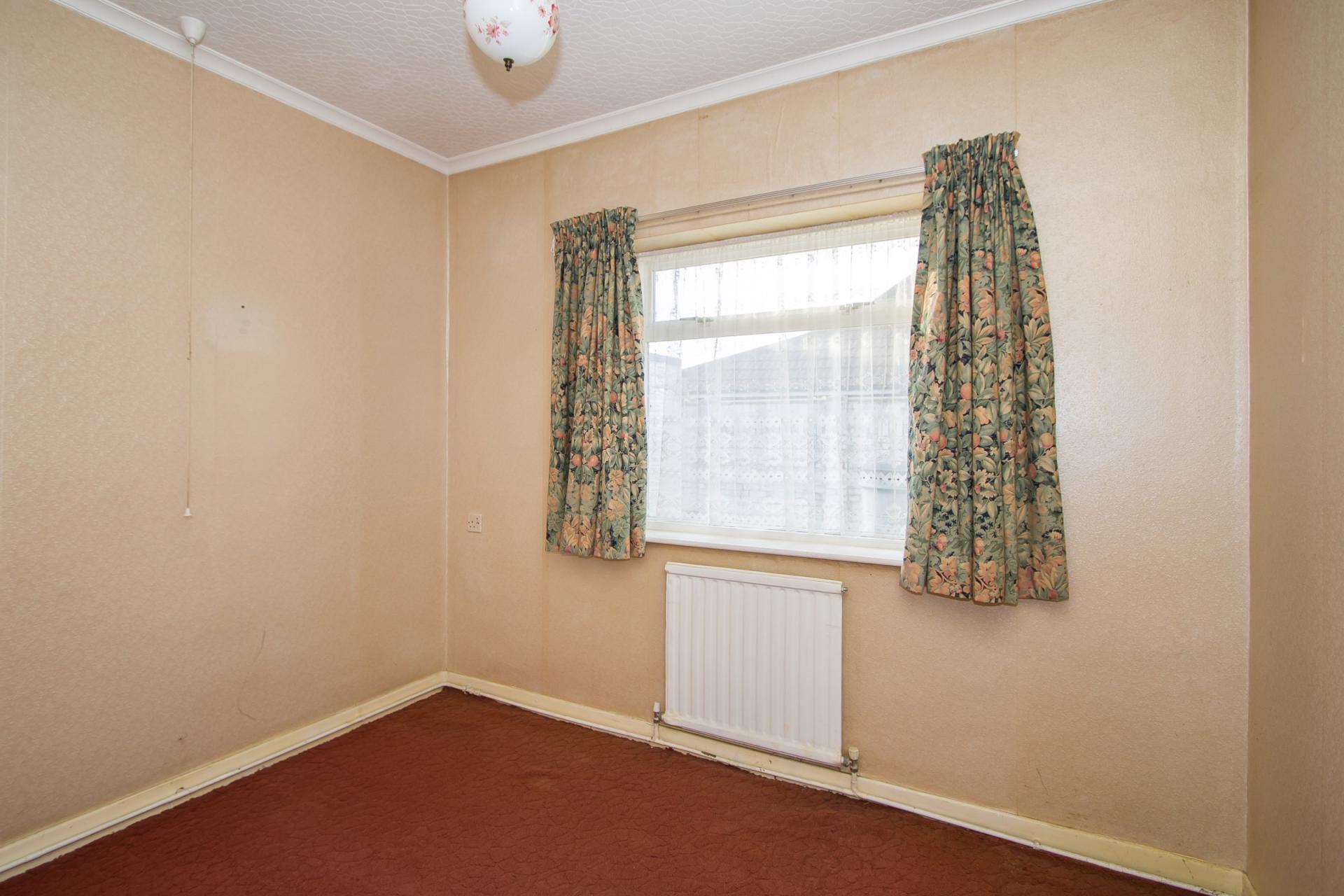Double bedroom with uPVC double glazed window to the front and an original stained glass window to the side. Fitted carpet. Central heating radiator. Fitted wardrobes to one wall. Power points.