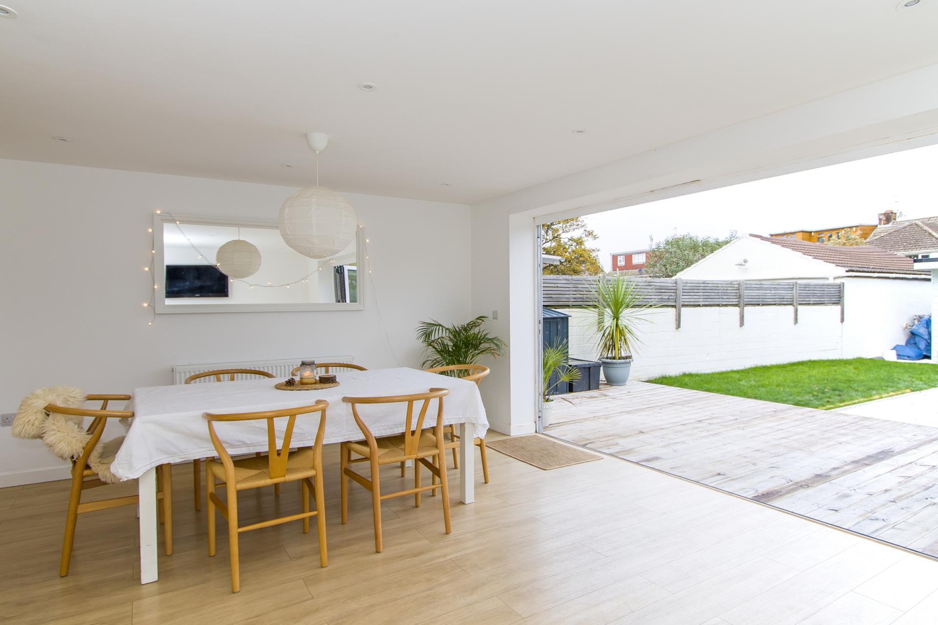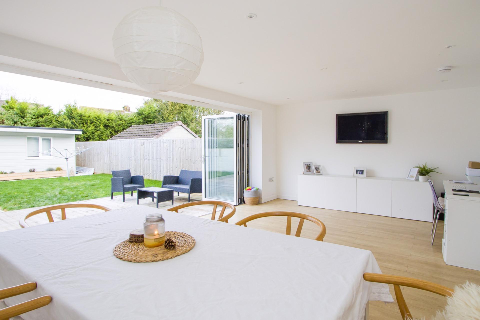 Part of the new open plan ground floor living space, this is an excellent family area and ideal for entertaining, with a great view over the garden through 5 pane bi-fold doors. Wood effect laminate flooring. Recessed lights. Central heating radiator. Power points and TV point.