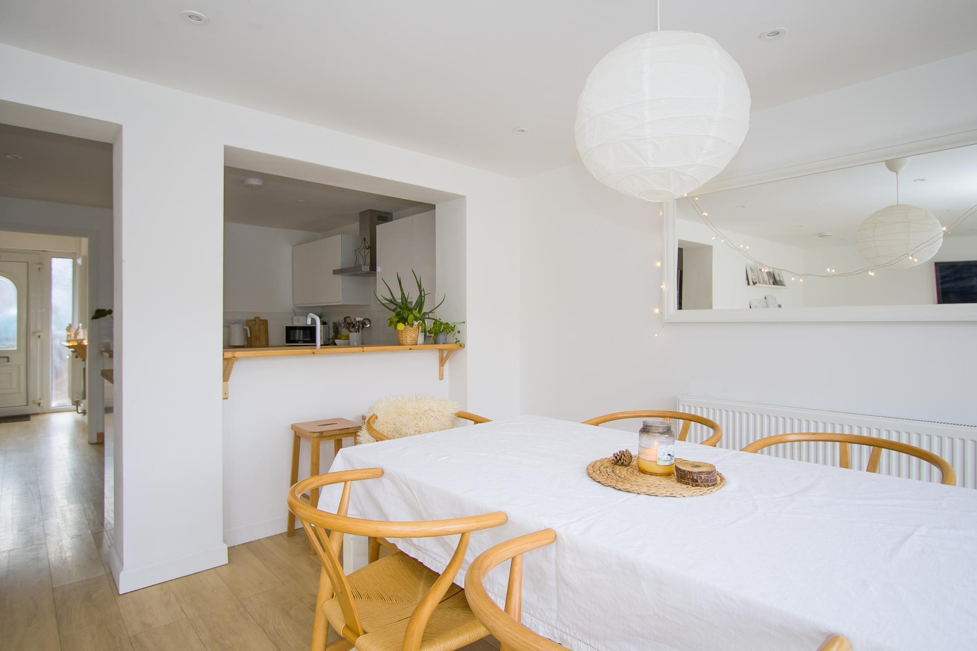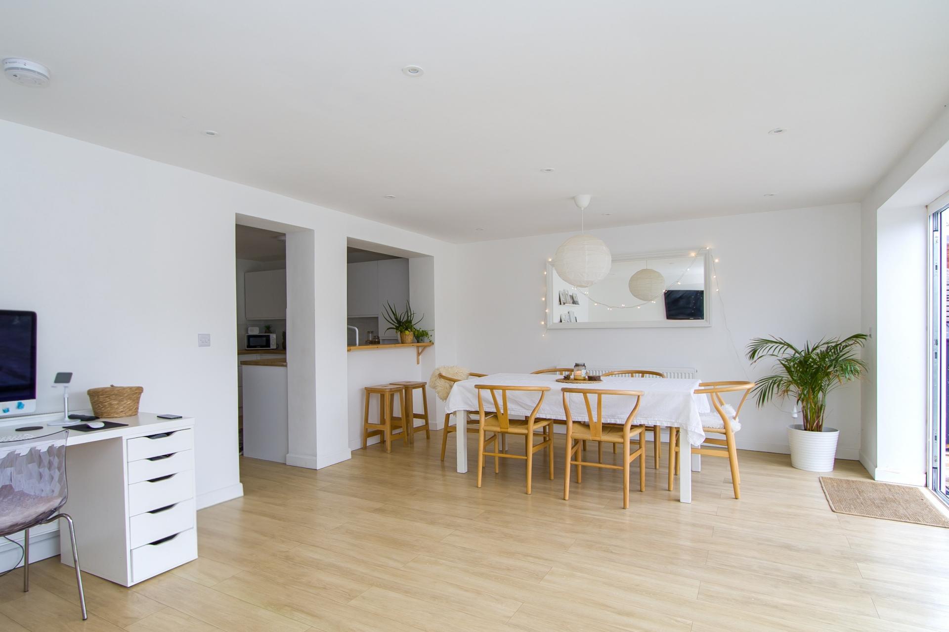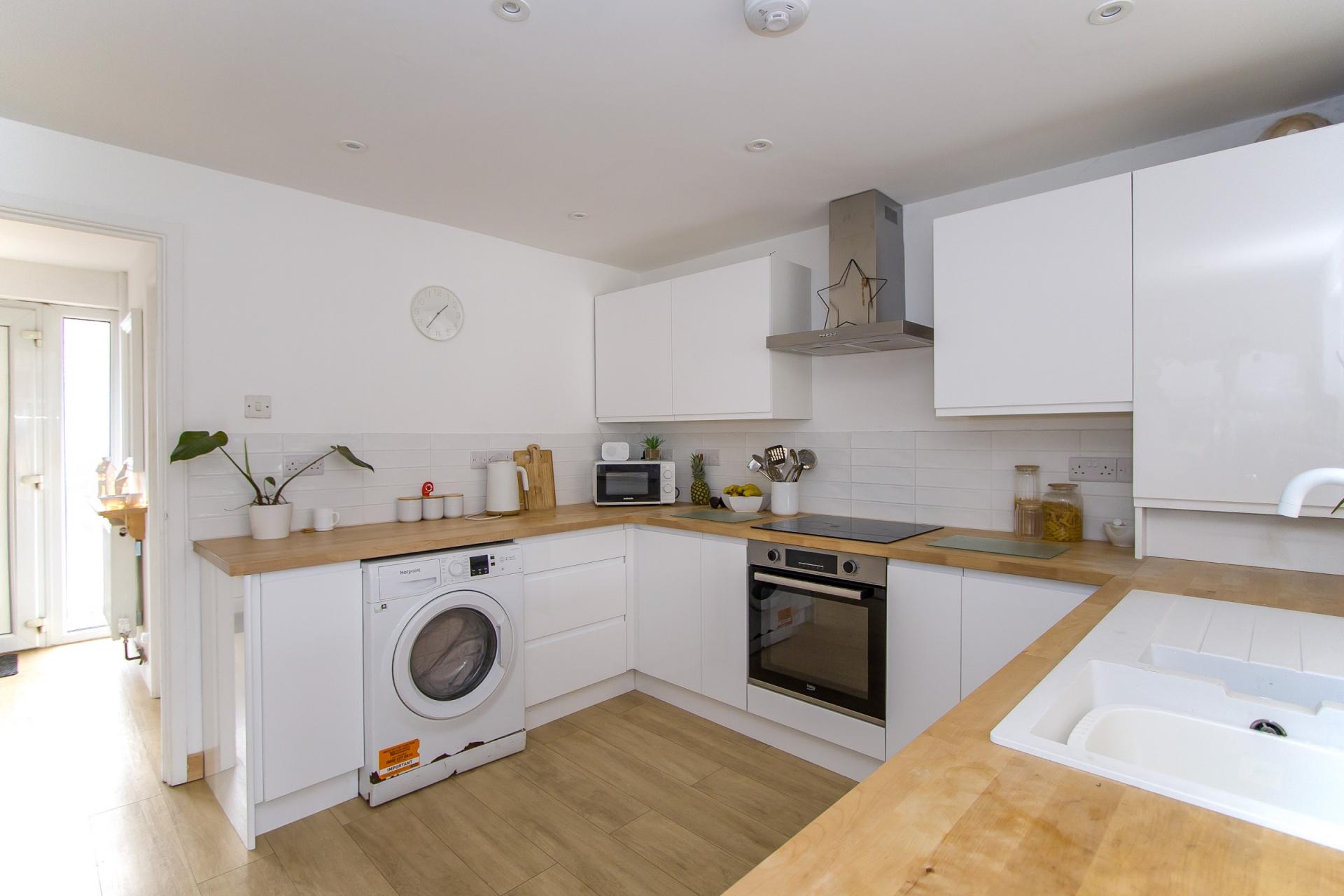 A new kitchen that opens into the extended living / dining room. Wood effect laminate flooring. Fitted kitchen comprising wall units and base units with white gloss doors, wooden work surfaces and tiled splashbacks. Integrated appliances including an electric oven, four zone electric hob, extractor hood and dishwasher. Space for a tall fridge freezer. Plumbing for washing machine. Recessed lights. Power points.