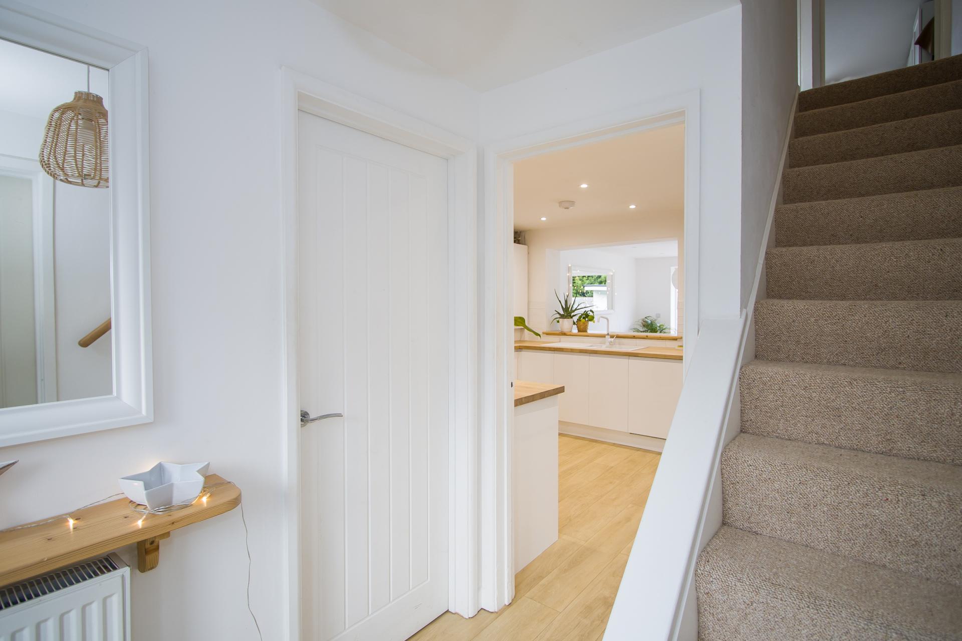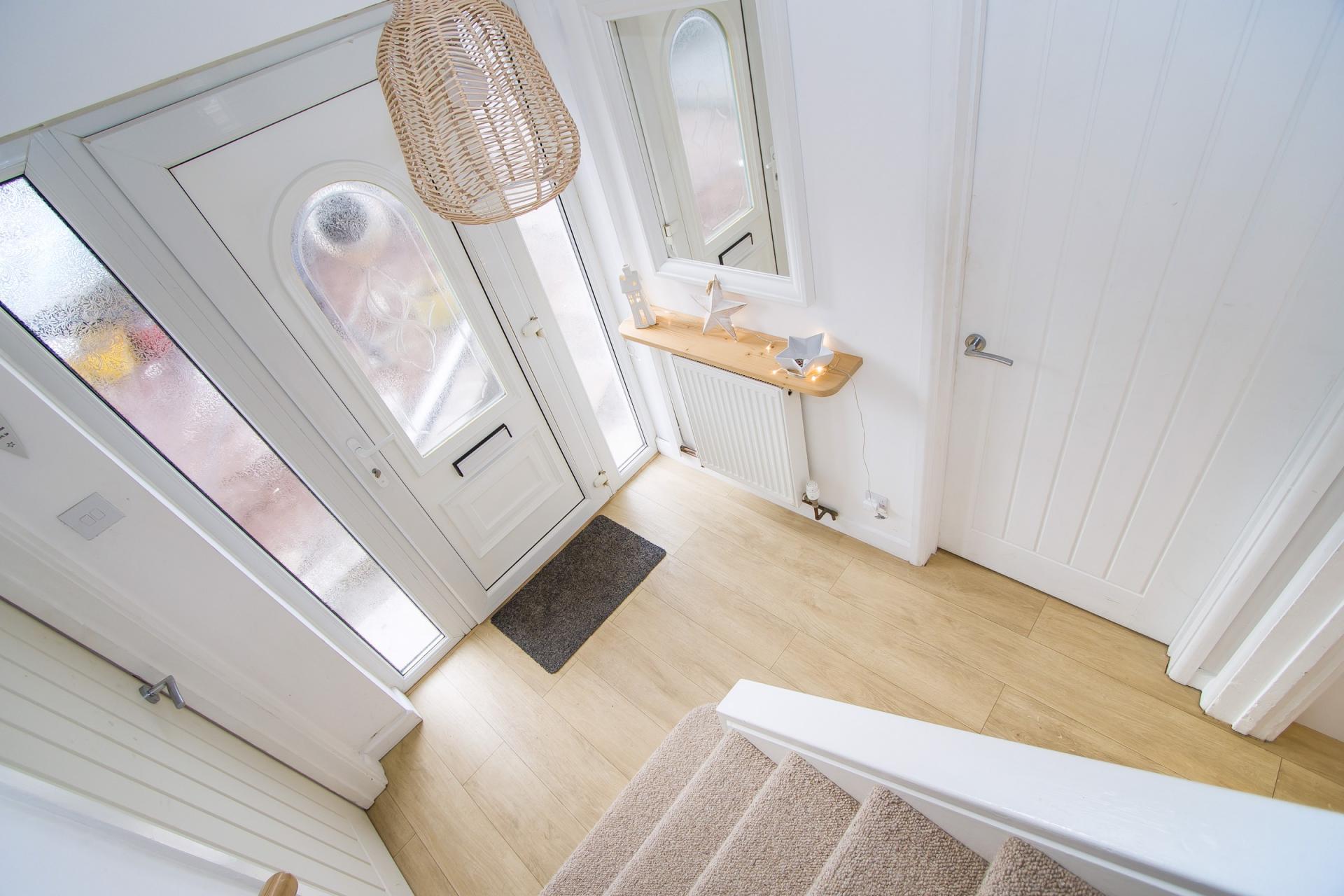 uPVC double glazed front door with glazed panels to either side. Wood effect laminate flooring. Doors to the cloakroom, lounge and kitchen.