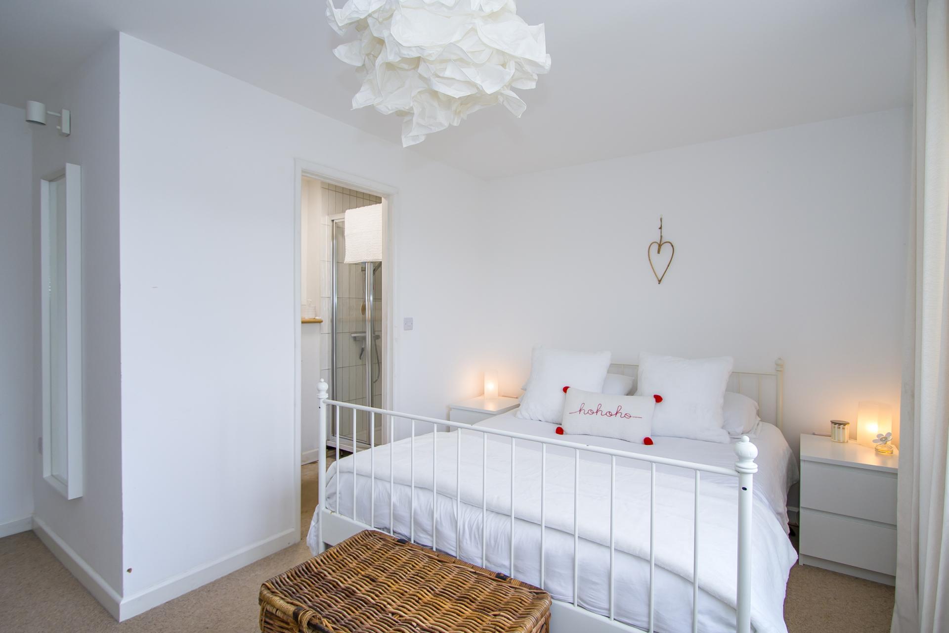 A new, spacious double bedroom to the rear overlooking the garden, and with an en-suite shower room. Fitted carpet. Central heating radiator. uPVC double glazed window. Power points.